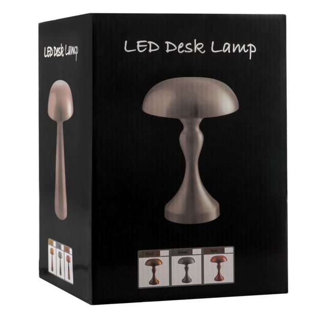 - Лампа выполнена в форме гриба с гладкой металлической текстурой и благородными оттенками, что делает её эффектным элементом любого интерьера.