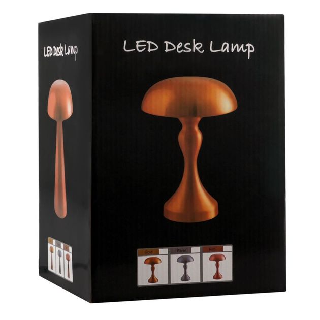 - Лампа выполнена в форме гриба с гладкой металлической текстурой и благородными оттенками, что делает её эффектным элементом любого интерьера.