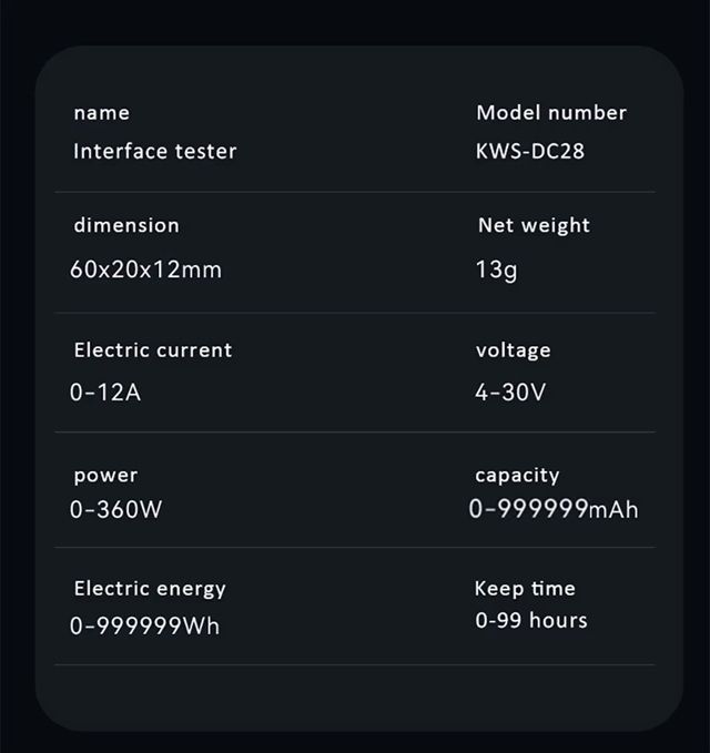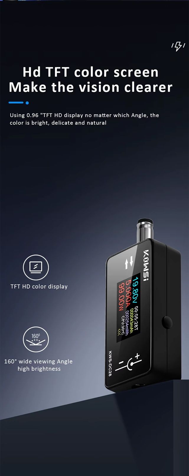 - Яркий 0.96-дюймовый TFT-дисплей отображает ключевые параметры: напряжение, ток, мощность, ёмкость, время и энергию.