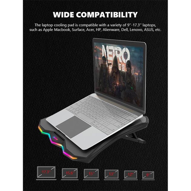 - Один вентилятор большого диаметра (180 мм) обеспечивает быстрый и стабильный отвод тепла от поверхности ноутбука, а регулируемая скорость вращения (от 570 до 800 об/мин) позволяет адаптировать мощность охлаждения под нагрузку устройства.