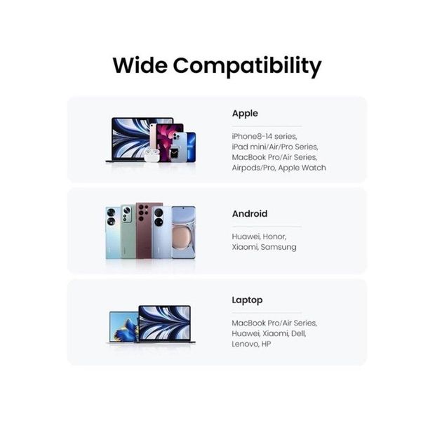 - Подходит для зарядки iPhone (включая последние модели), iPad, Apple Watch, MagSafe, AirPods, устройств Samsung, Google Pixel, а также планшетов и ноутбуков с Type-C.