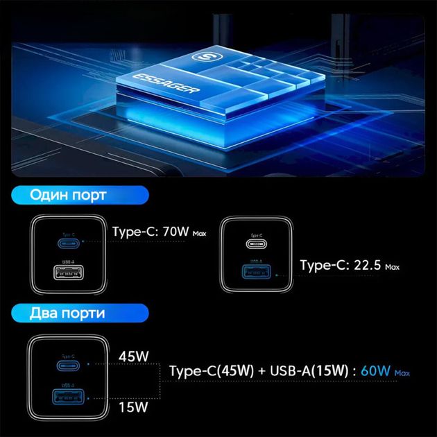 ESSAGER EZCT70 — это компактное и мощное зарядное устройство нового поколения, построенное на базе современной технологии GaN (галлиевый нитрид). Оно обеспечивает быструю, безопасную и энергоэффективную зарядку сразу двух устройств благодаря портам USB-A и Type-C. Поддержка протоколов Power Delivery и Quick Charge 3.0 делает его идеальным выбором как для повседневного использования, так и для поездок.