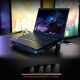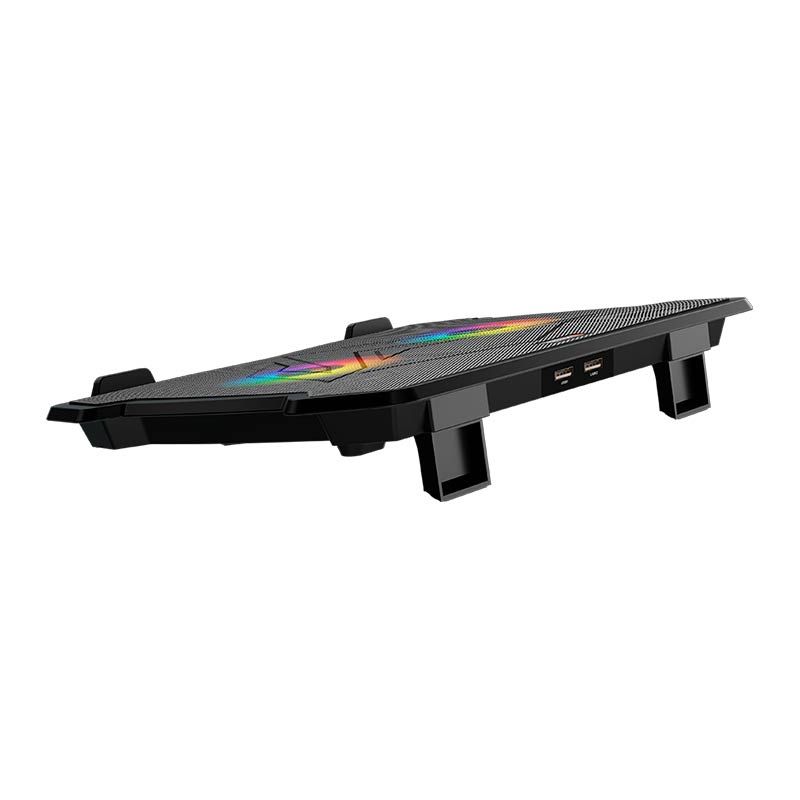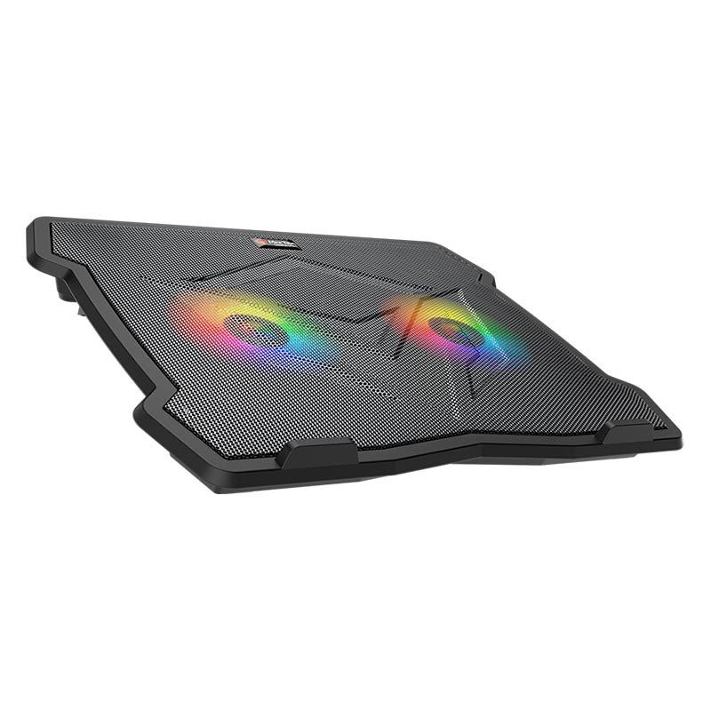 - Подставка оснащена двумя вентиляторами с тихим режимом работы, которые создают мощный поток воздуха, предотвращая перегрев ноутбука при длительных нагрузках. Встроенная алюминиевая панель дополнительно улучшает теплоотведение.