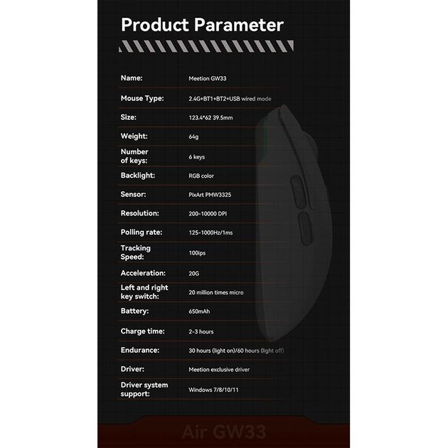 MEETION GW33 — это современная ультралегкая игровая мышь с высокоточным сенсором PMW3325, тройным режимом подключения (проводное, 2.4G, Bluetooth) и стильной RGB-подсветкой. Модель разработана для геймеров, которым важны высокая точность, надежность и свобода движений без задержек.