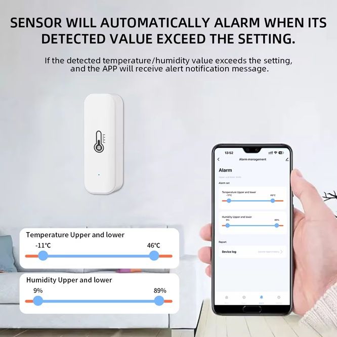 - Датчик можно использовать как источник данных для запуска сценариев в системе умного дома, например: включение кондиционера при повышении температуры.