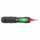 - Интеллектуальная система автоматически различает фазный и нулевой провод. При контакте с фазой экран засвечивается красным и звучит сигнал. При обнаружении нулевой линии — экран становится зелёным, а сигнализация отсутствует.