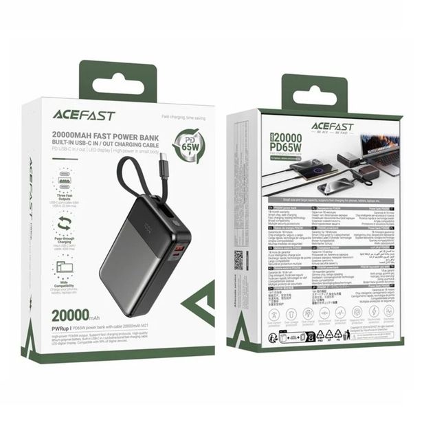 Внешний аккумулятор ACEFAST M21 — это высокопроизводительный и надежный повербанк, способный быстро заряжать даже энергоемкие устройства, такие как ноутбуки, планшеты и игровые консоли. Благодаря поддержке протокола Power Delivery (PD) мощностью до 65 Вт, встроенному Type-C кабелю и емкости 20000 мАч, он идеально подходит для тех, кто часто находится в движении, путешествует или работает в полевых условиях.