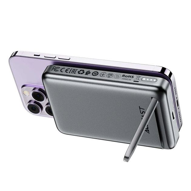 - Встроенная выдвижная подставка позволяет разместить смартфон под удобным углом во время зарядки, что добавляет удобства для просмотра видео или для видеозвонков.