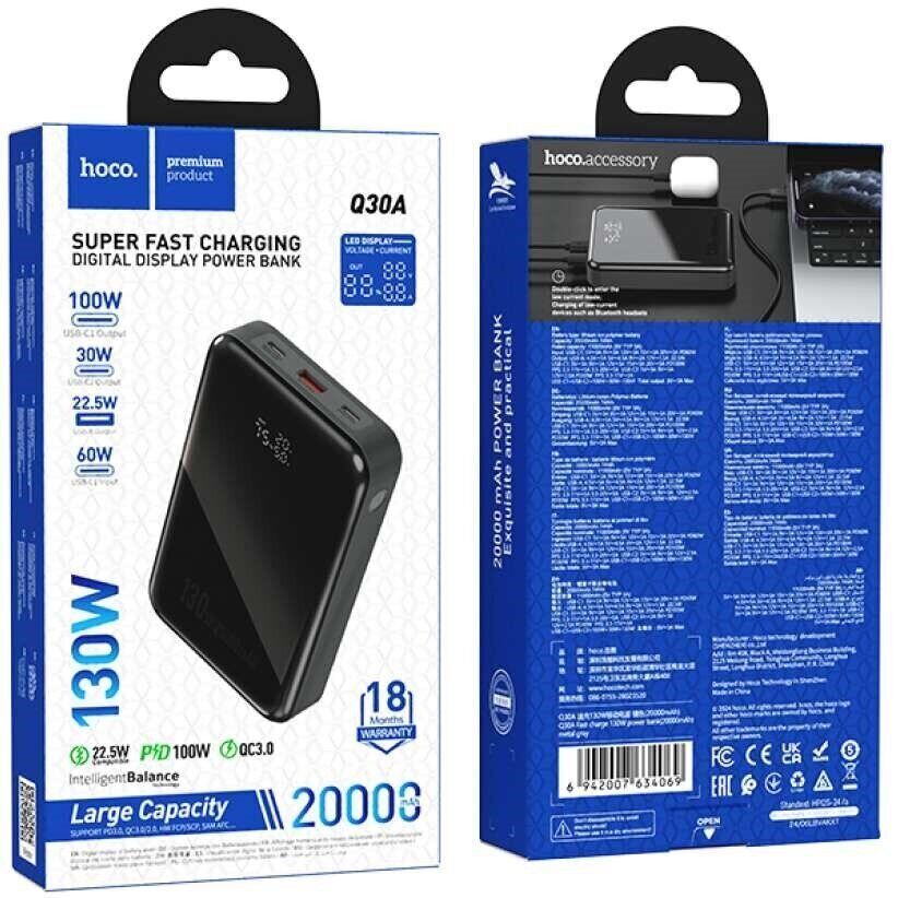 HOCO Q30A Fast charge 130W power bank (20000mAh) Metal Gray Повербанк