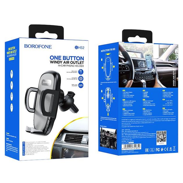 BOROFONE BH52 — это надежный и эргономичный автодержатель для смартфона, разработанный для установки на вентиляционную решётку автомобиля. Современный дизайн, удобная конструкция и универсальная совместимость делают его идеальным решением для комфортного и безопасного использования телефона в пути.
