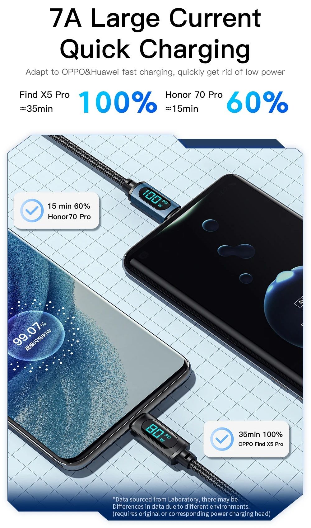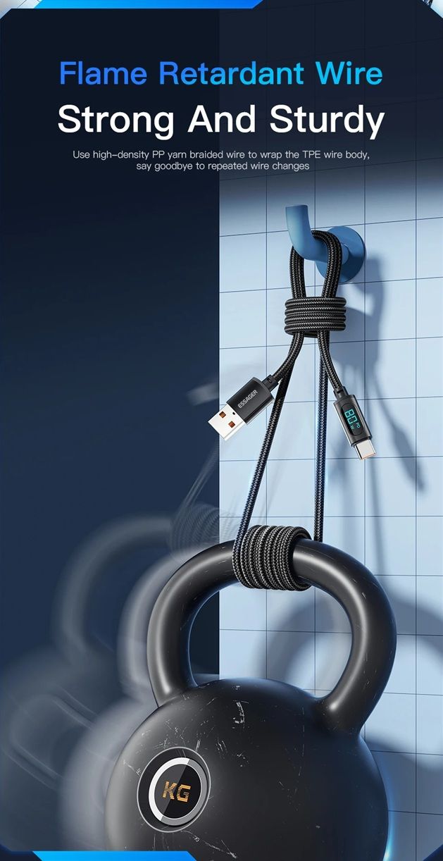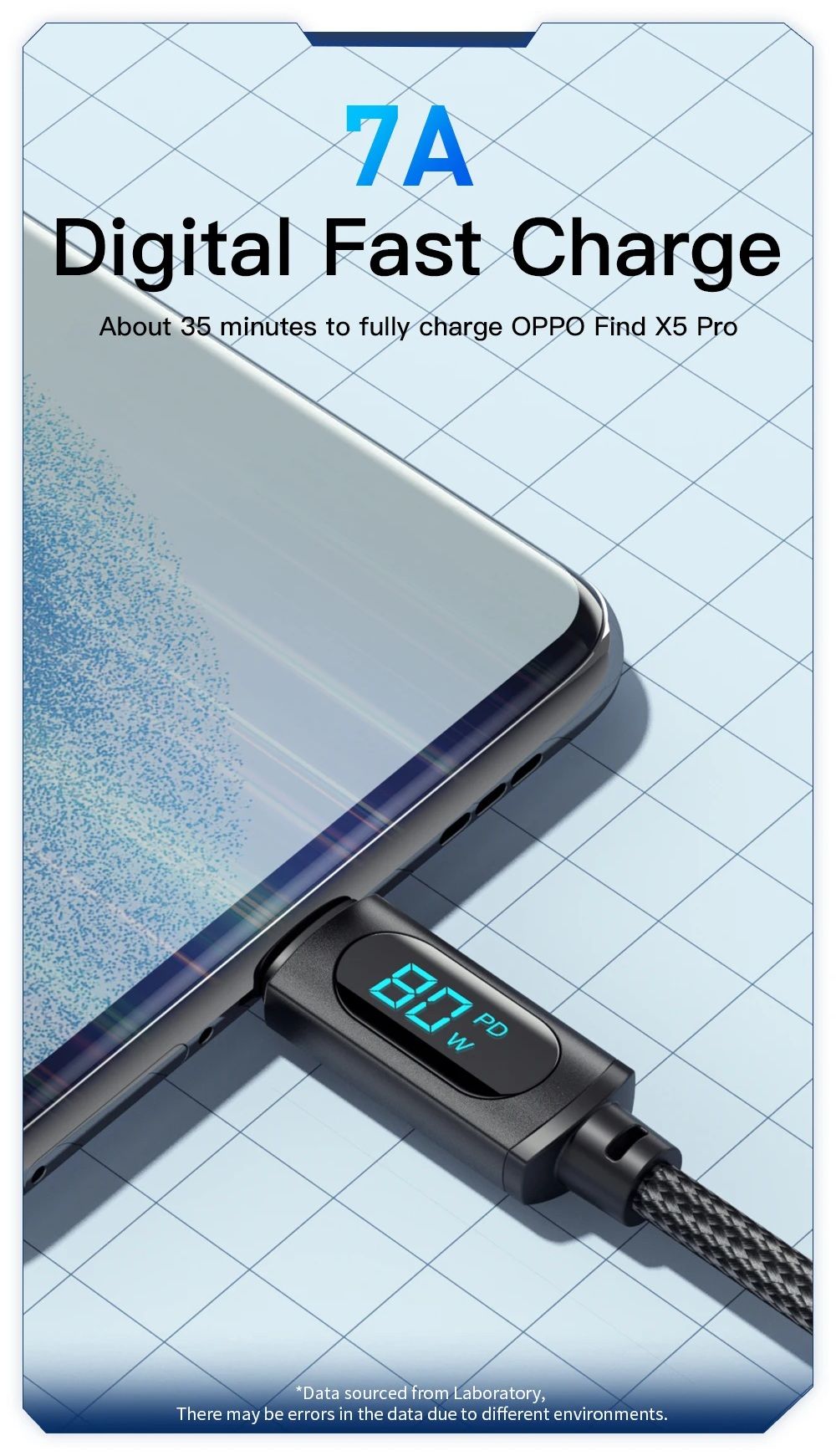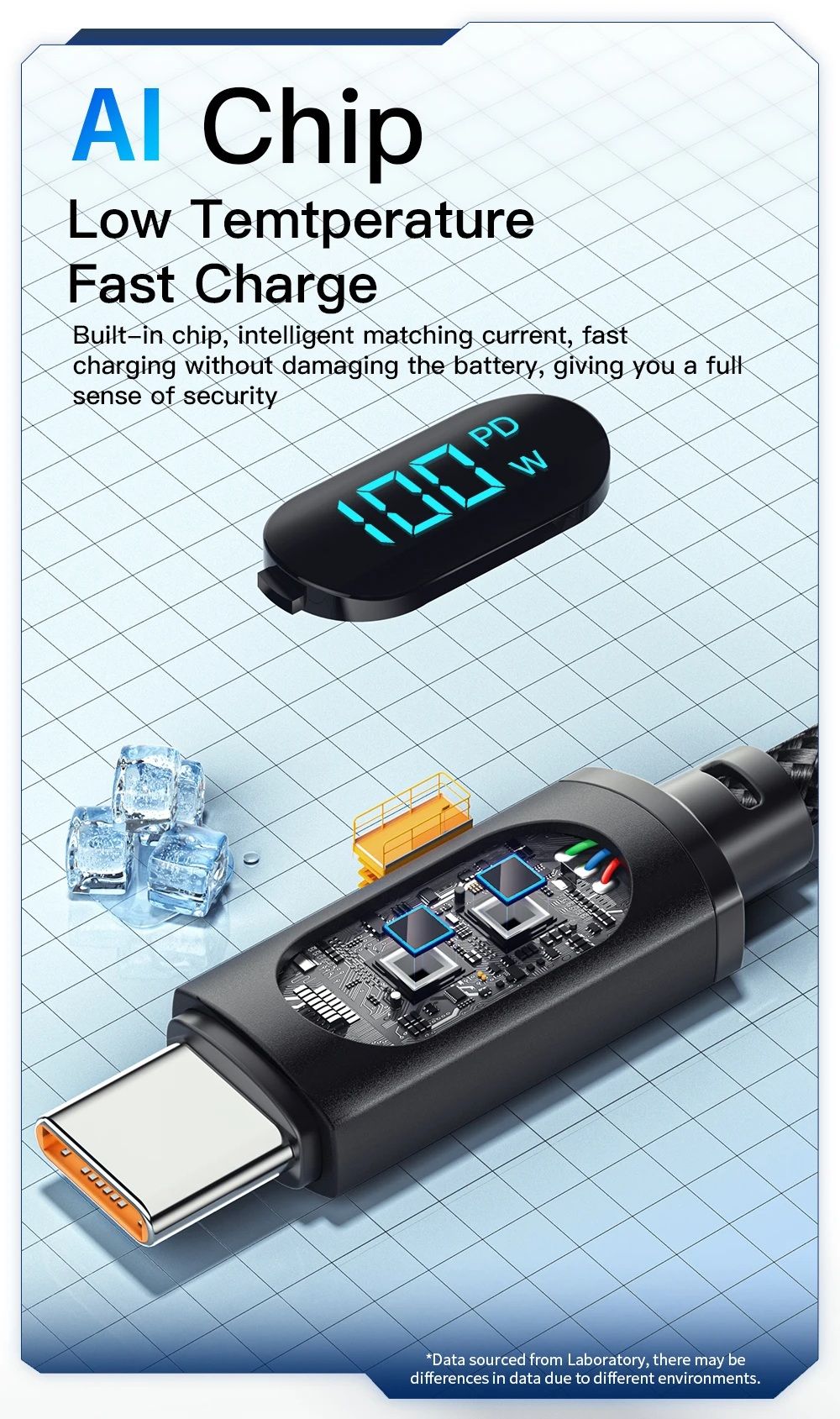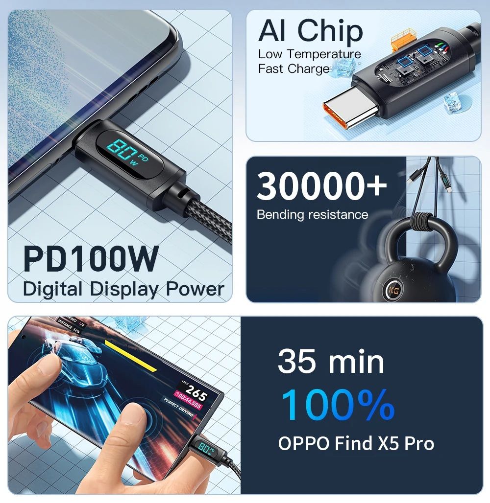 Это высокоскоростной кабель для зарядки и передачи данных, поддерживающий мощность до 100 Вт и ток до 7А. Он оснащён встроенным цифровым дисплеем, отображающим мощность зарядки в реальном времени. Надёжная конструкция, премиальные материалы и совместимость с широким спектром устройств делают этот кабель универсальным решением для повседневного использования и быстрой зарядки.