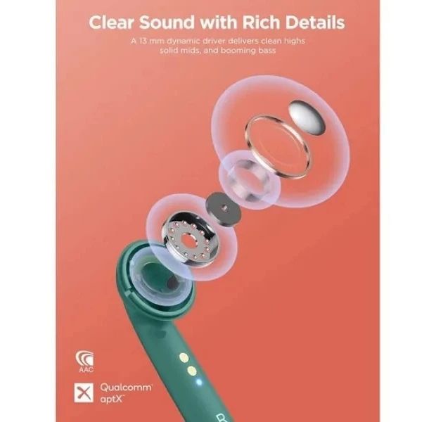 - Чип Qualcomm QCC3020 и Bluetooth 5.0 обеспечивают стабильное соединение, минимальные задержки и высокую скорость передачи данных.