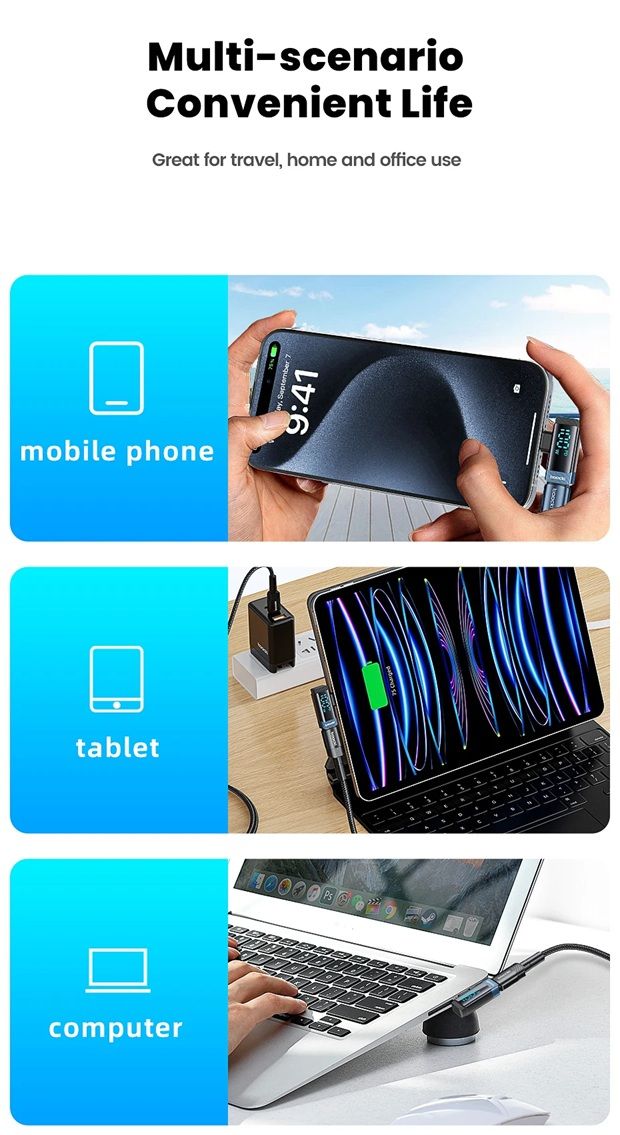 - Подходит для MacBook, iPhone 15/16 (с Type-C), Samsung, Xiaomi, Realme, OnePlus, iPad и многих других гаджетов с разъёмом Type-C.