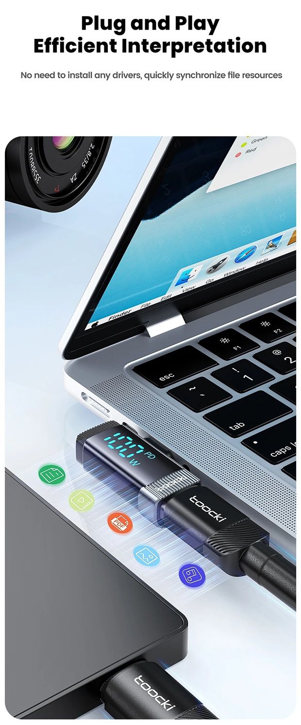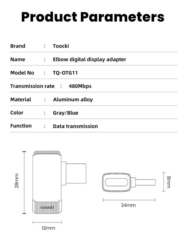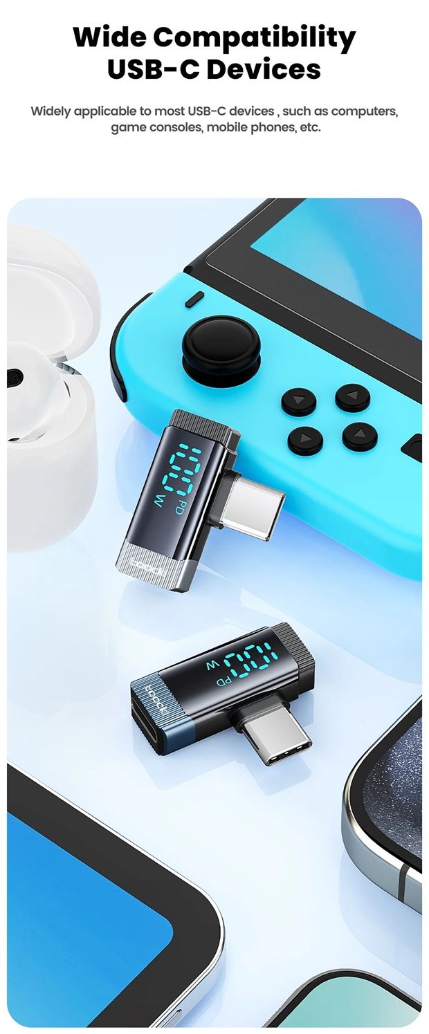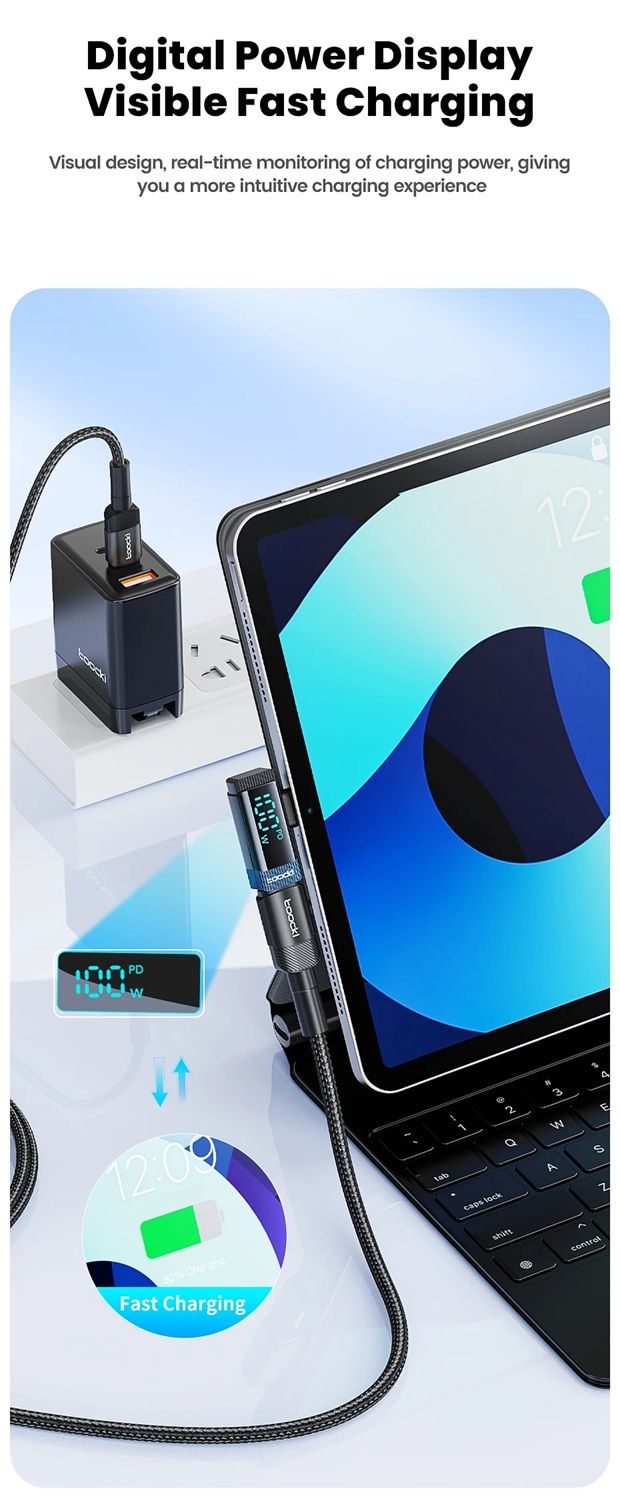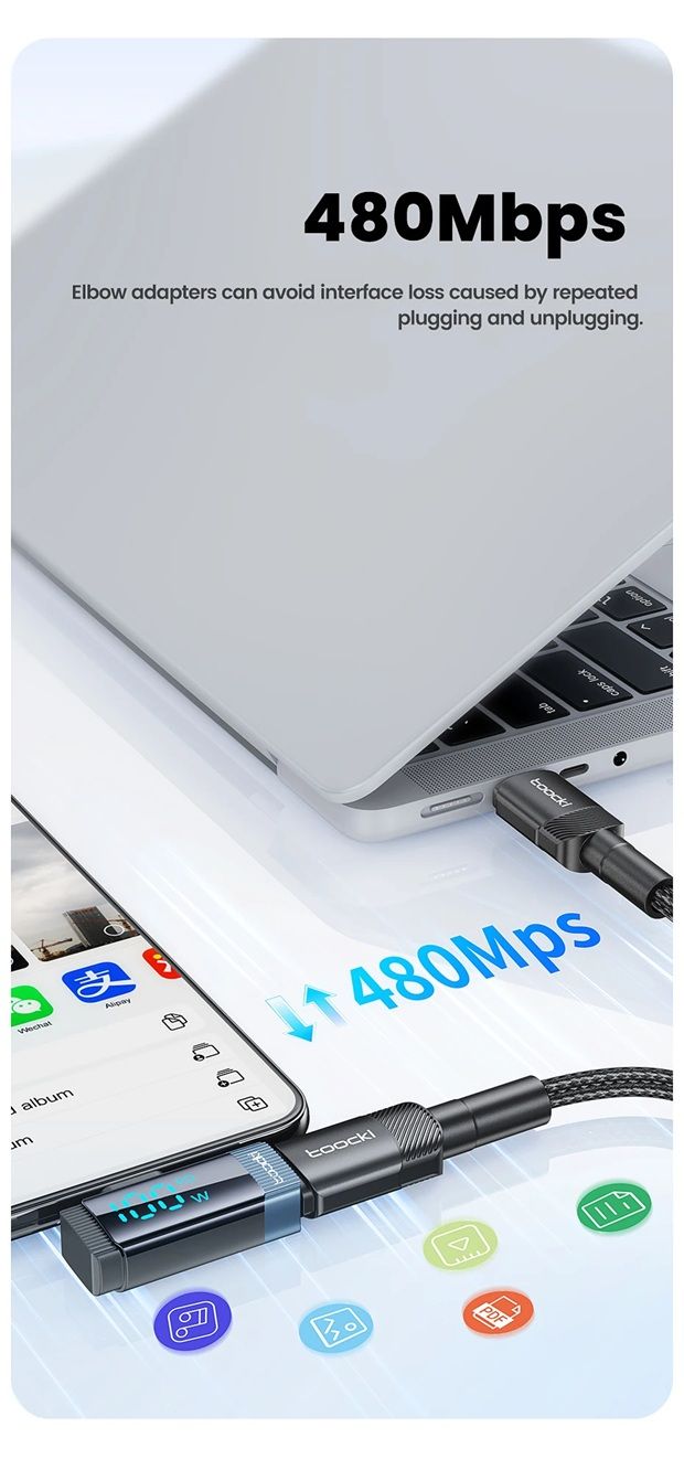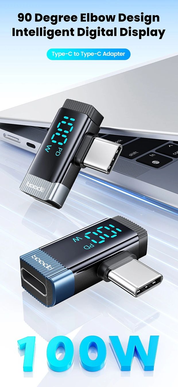 Toocki TQ-X33C2G — это современный 90-градусный переходник с цифровым дисплеем, который преобразует прямой разъём Type-C в угловой, обеспечивая удобство при подключении устройств в любых условиях — дома, в офисе или во время игр. Этот адаптер поддерживает сверхбыструю зарядку мощностью до 100 Вт (PD), передачу данных со скоростью до 480 Мбит/с, а также оснащён интеллектуальным цифровым экраном, отображающим текущую мощность зарядки в режиме реального времени.