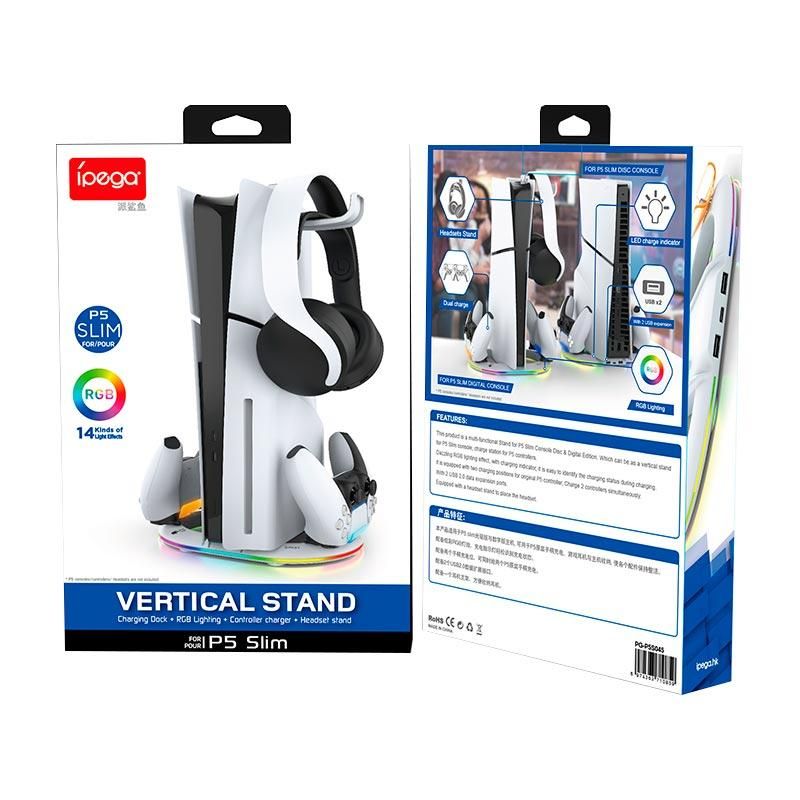 Ipega PG-P5S045H — это многофункциональная вертикальная док-станция, разработанная специально для PlayStation 5 Slim (версии с дисководом и без). Она объединяет в себе зарядную станцию для геймпадов, расширение USB-портов, стойку для консоли и органайзер для наушников — всё в одном стильном и компактном устройстве.