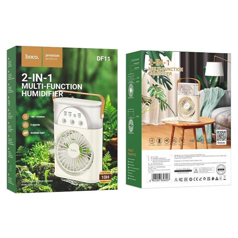 HOCO DF11 — это компактный, стильный и многофункциональный гаджет, объединяющий в себе вентилятор, увлажнитель и ночное освещение. Отлично подходит для домашних и офисных условий, обеспечивает прохладу, комфорт и уют при минимуме усилий.