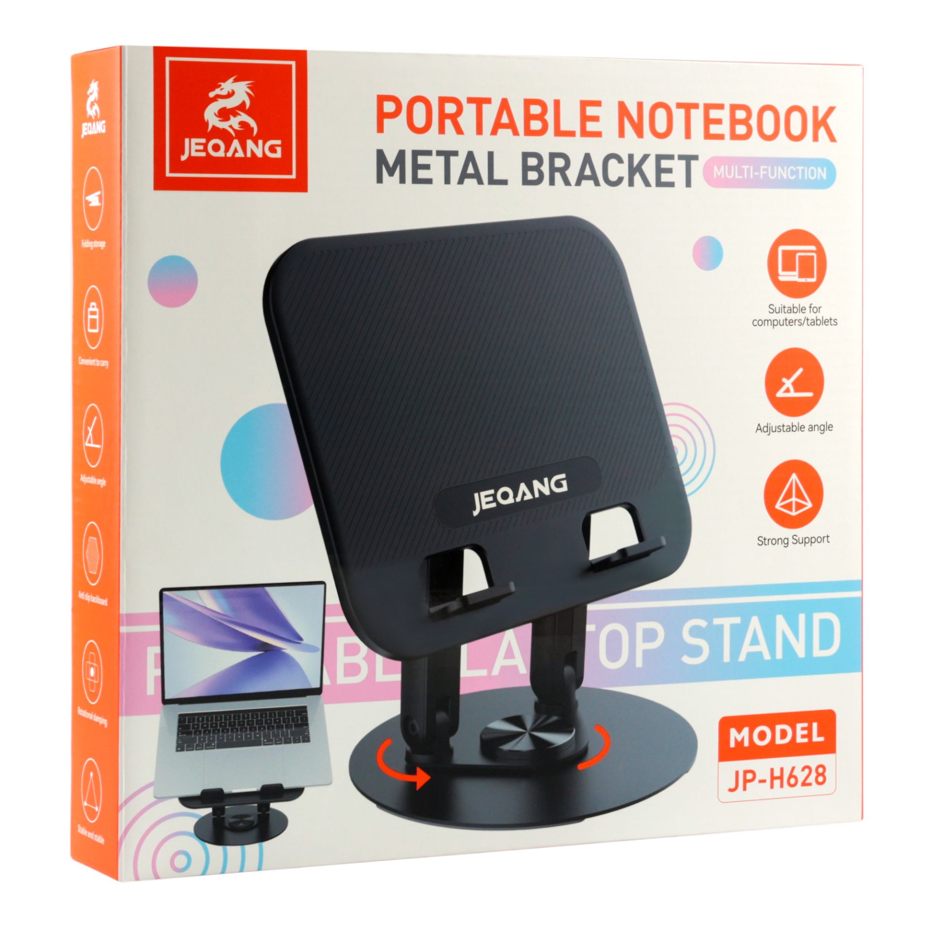 Jeqang JP-H628 — это продуманная до мелочей подставка для ноутбуков и планшетов, сочетающая современный дизайн, прочные материалы и эргономику. Она помогает создать правильное положение экрана на уровне глаз, снижая нагрузку на шею, спину и запястья при длительной работе. Эта компактная, лёгкая и универсальная подставка идеально подходит как для дома, так и для офиса.