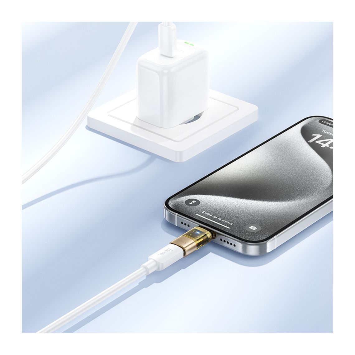 HOCO UA36D — это миниатюрный переходник, позволяющий подключать устройства Apple с разъёмом Lightning к зарядным устройствам, повербанкам и кабелям с современным интерфейсом Type-C. Модель сочетает стильный полупрозрачный дизайн с LED-подсветкой и поддержку быстрой зарядки с током до 3А, обеспечивая стабильную и надёжную работу.