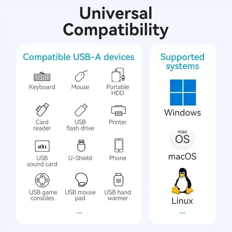 - Поддерживает работу с любыми операционными системами (Windows, macOS, Linux) и большинством USB-устройств: флешки, жёсткие диски, принтеры, смартфоны, веб-камеры и другие.