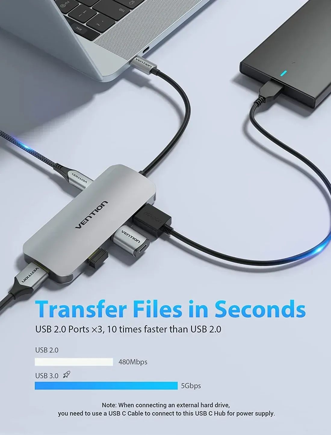 Vention USB-хаб Type-C к HDMI/USB 3.0x3/SD/TF/PD Docking Station серый 0.15M алюминиевый корпус TOJHB
