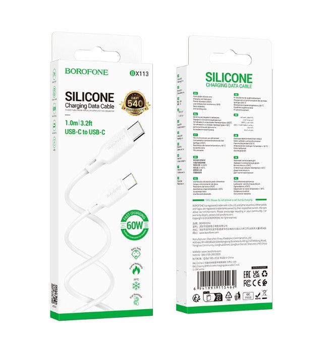 USB кабель Borofone BX113 силикон Type-C to Type-C 60W белый