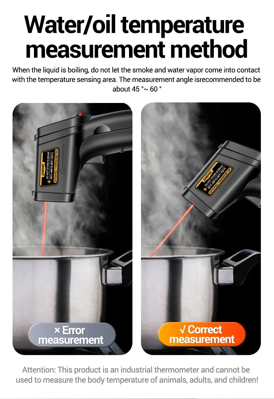 - При измерении температуры жидкостей не допускайте попадания пара на сенсор — держите термометр под углом 45–60°.