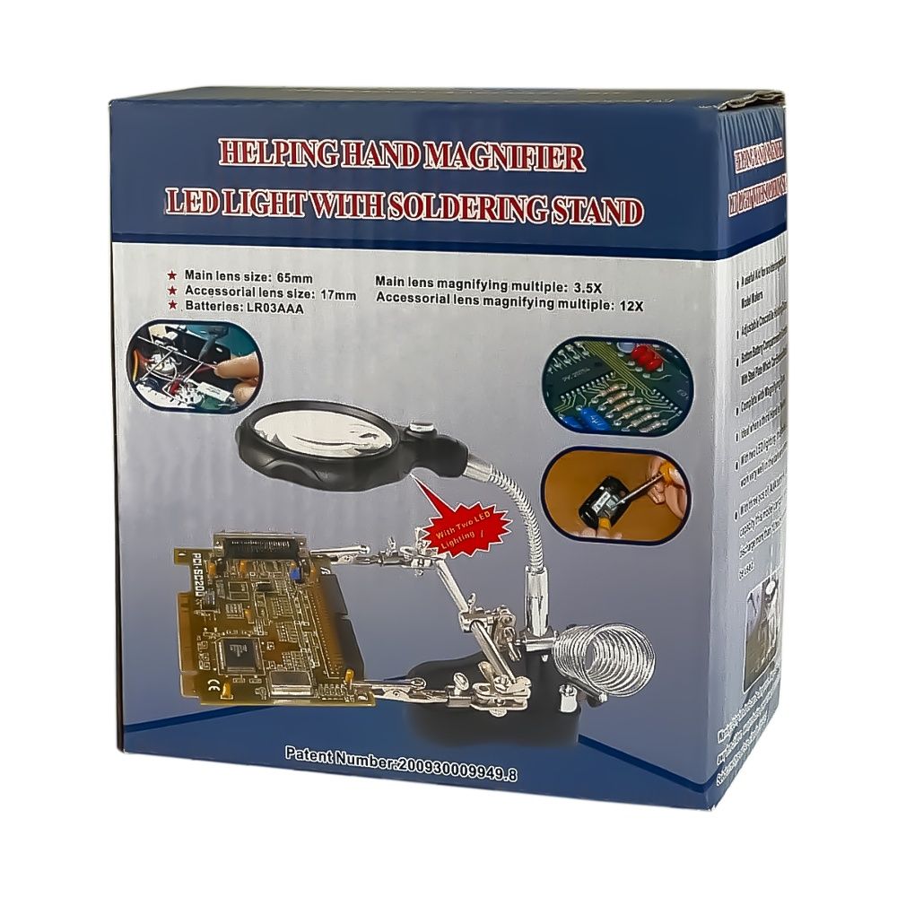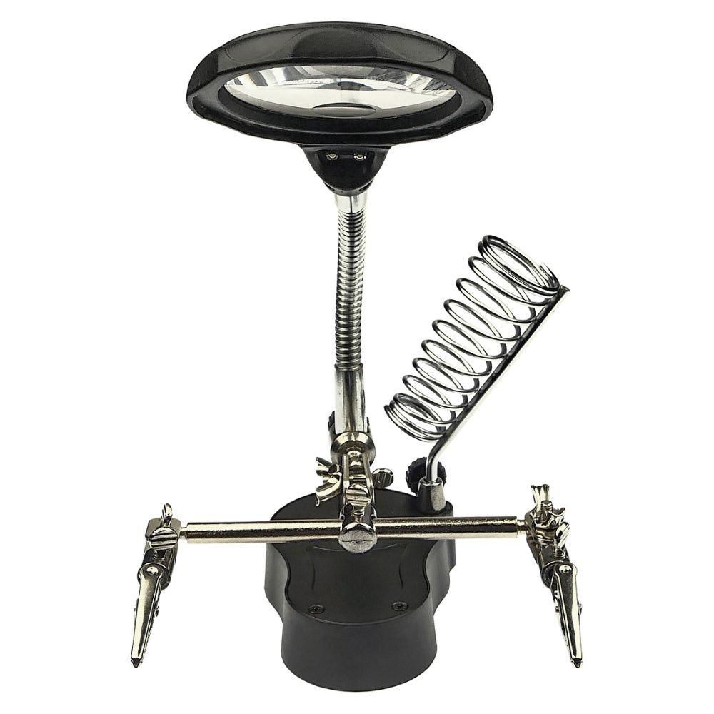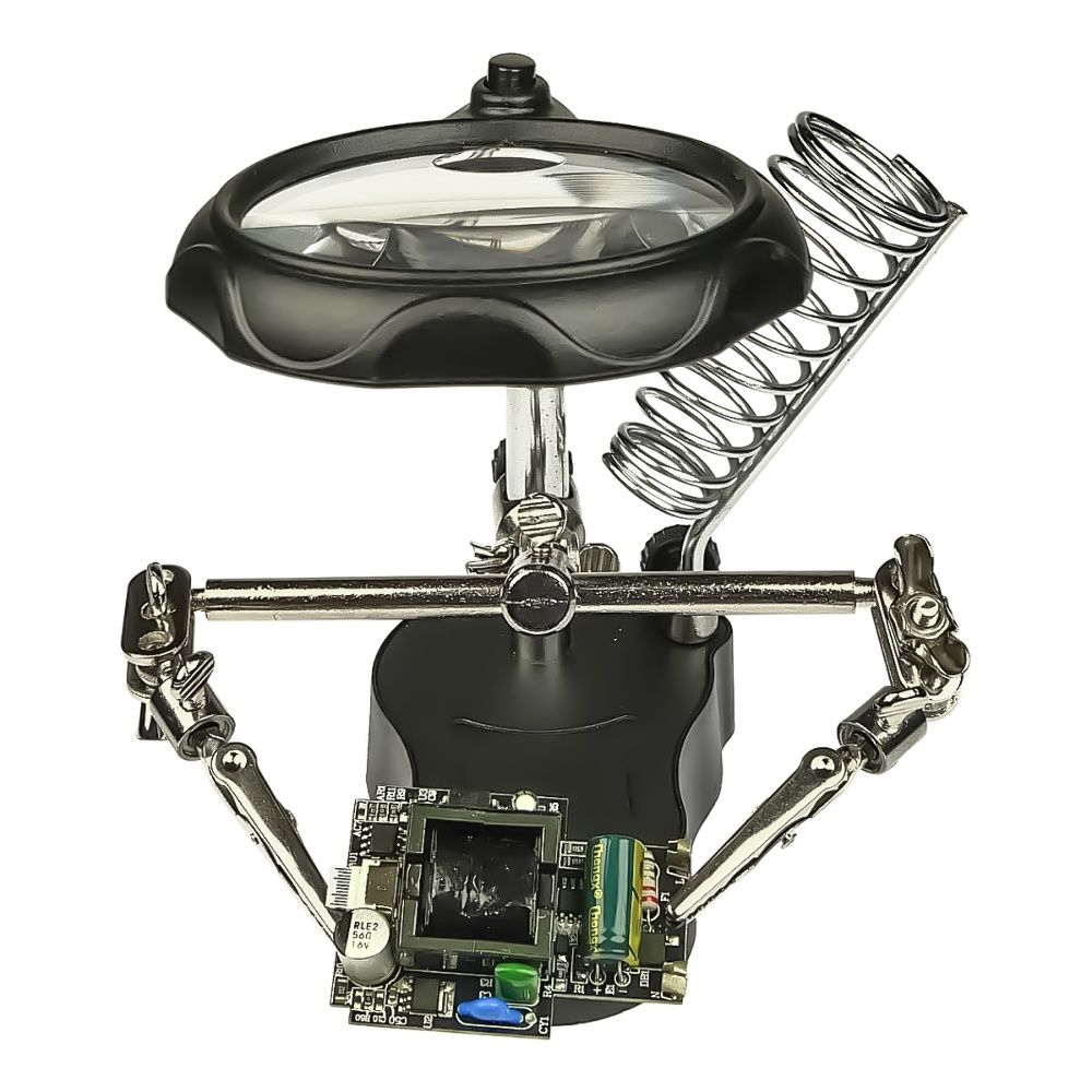 Держатель для плат и паяльника MG16126-A — это универсальное приспособление типа «третья рука», предназначенное для работы с мелкими деталями, пайки, ремонта электроники, ювелирных изделий и моделизма. Конструкция сочетает двойную увеличительную линзу, светодиодную подсветку, регулируемые зажимы и подставку для паяльника, обеспечивая удобство и точность в работе.