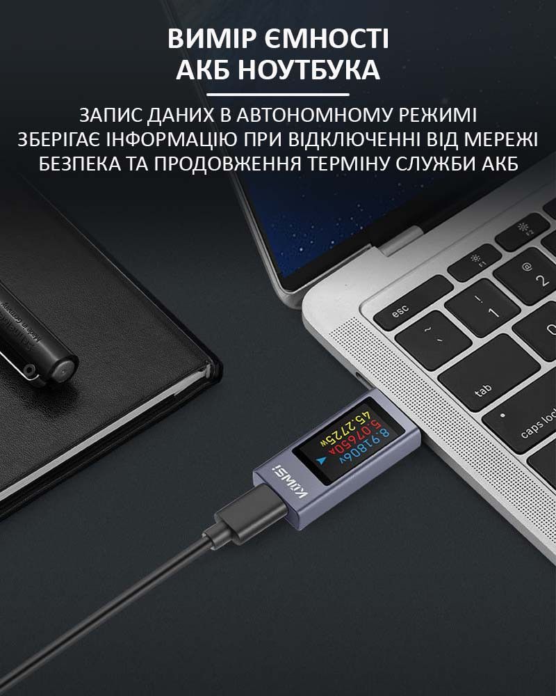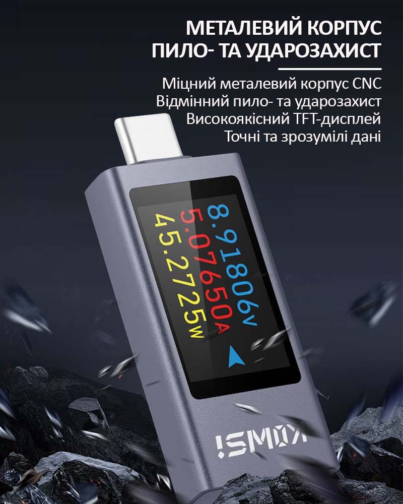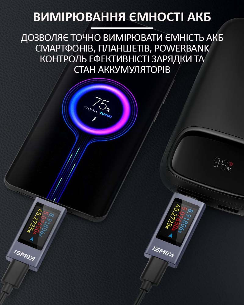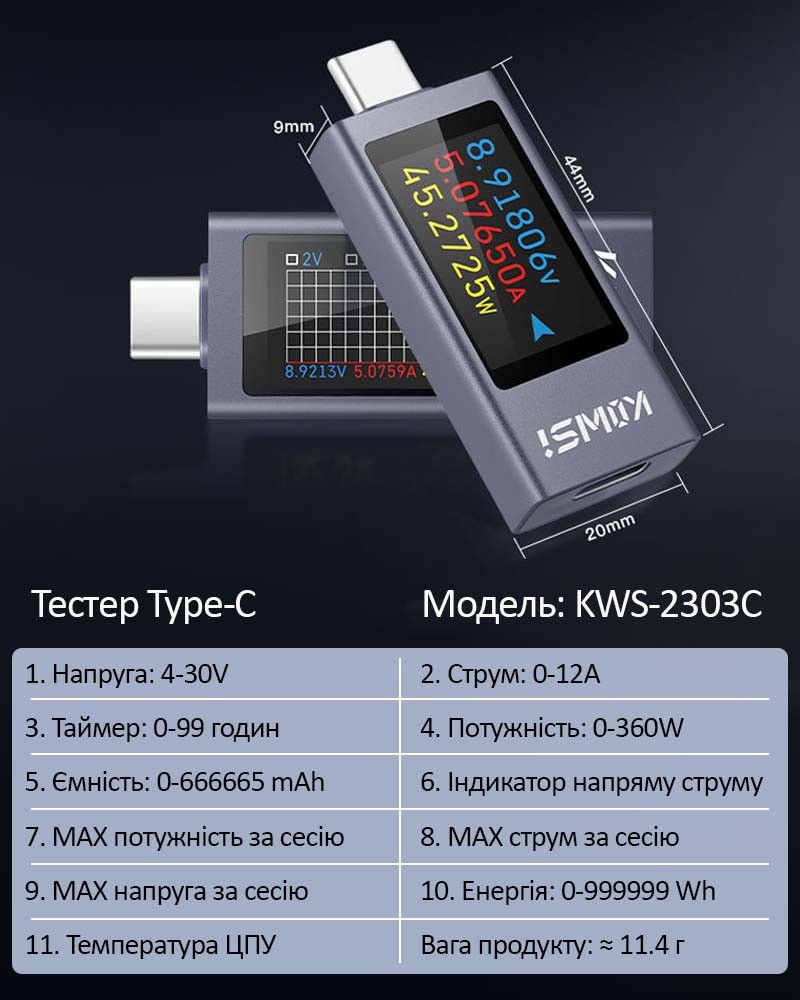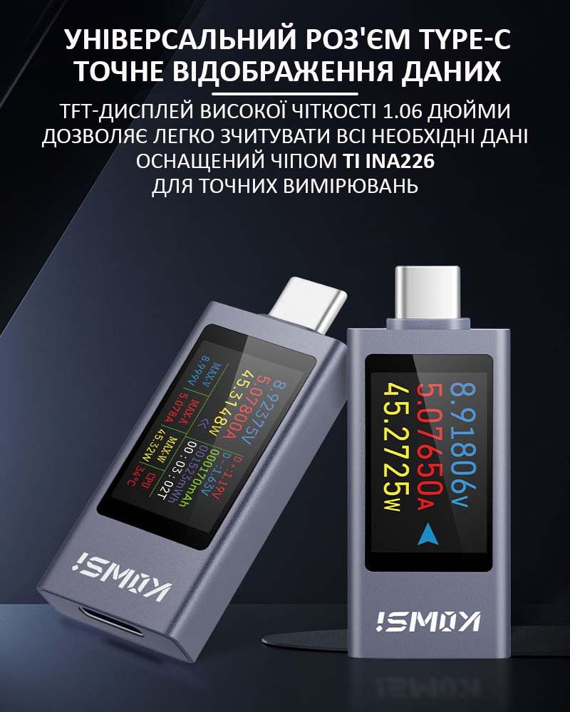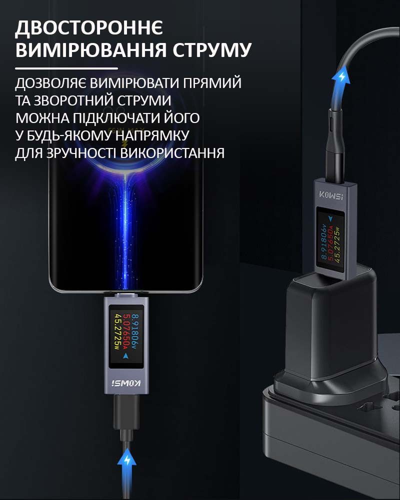 USB тестер KOWSI KWS-2303C Type-C — это современный и многофункциональный инструмент для точного контроля параметров зарядки устройств. Он сочетает прочный металлический корпус, поддержку широкого спектра протоколов быстрой зарядки и высокоточный измерительный функционал. Подходит для использования со смартфонами, планшетами, ноутбуками, зарядными станциями и другими цифровыми устройствами.