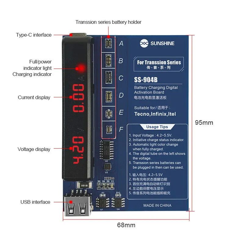 Sunshine SS-904B – этосовременнаяцифроваяплатадляактивации и зарядкиаккумуляторовсмартфоновTecno, Itel и Infinix. Устройствообеспечиваетбезопасноевосстановление и тестирование АКБ, оснащено двойным цифровым дисплеем и системой интеллектуальной индикации, что делает его незаменимым инструментом для сервисных центров и мастеров по ремонту мобильной техники.