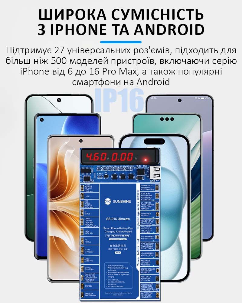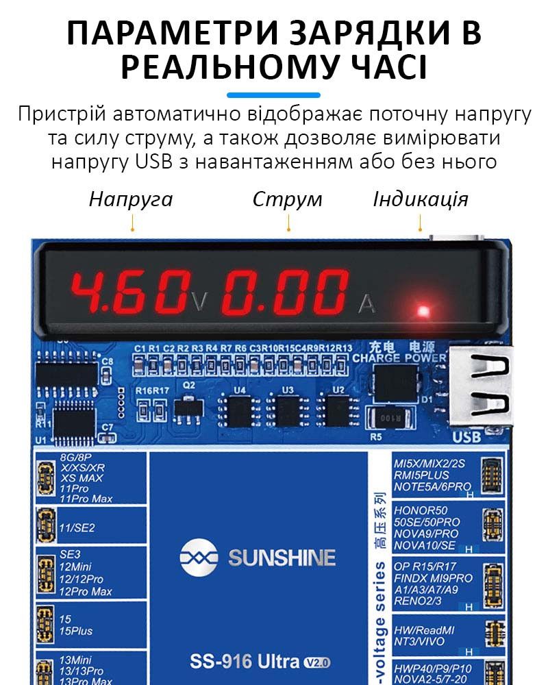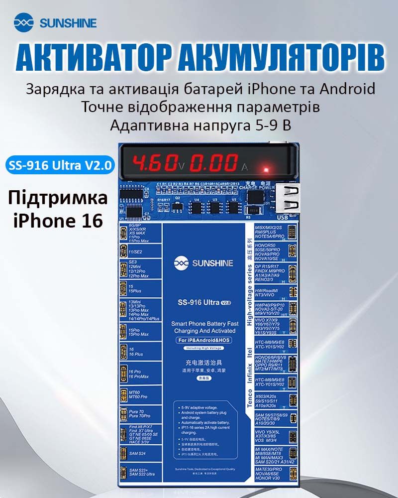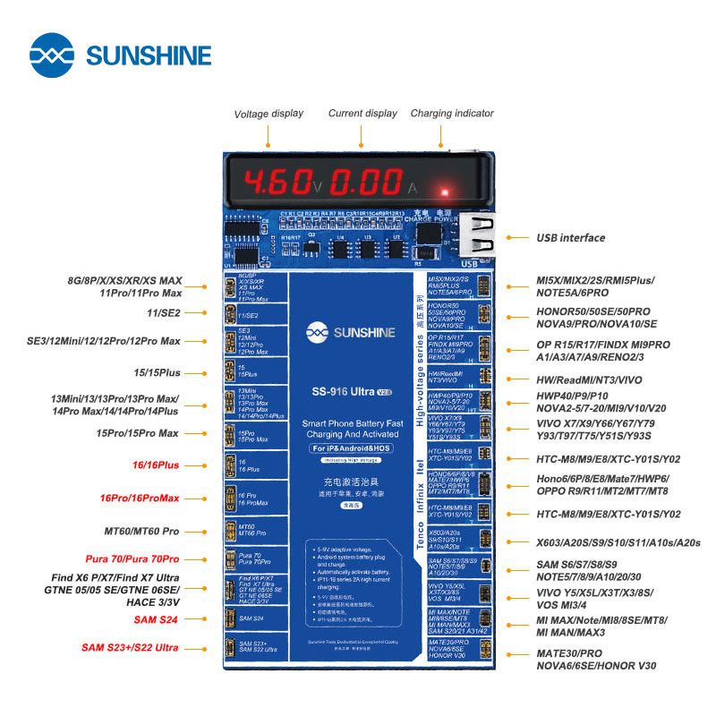 Sunshine SS-916 Ultra — этосовременныйтестер-активатораккумуляторов, предназначенныйдлязарядки, активации и диагностикилитий-ионныхаккумуляторов смартфонов. Устройствоподдерживаетболее 500 моделей, включая iPhone (6–16 ProMax) и большинство популярных Android-устройств (Samsung, Huawei, Xiaomi, Oppo, Vivo, Infinix, Tecno).