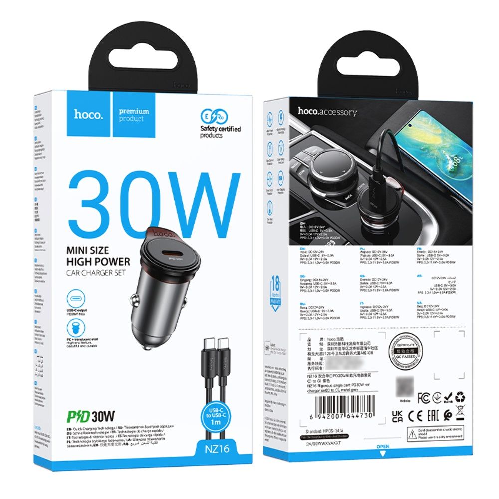 Серое металлическое зарядное устройство для автомобиля Hoco NZ16 Type-C PD 30W + кабель Type-C на Type-C