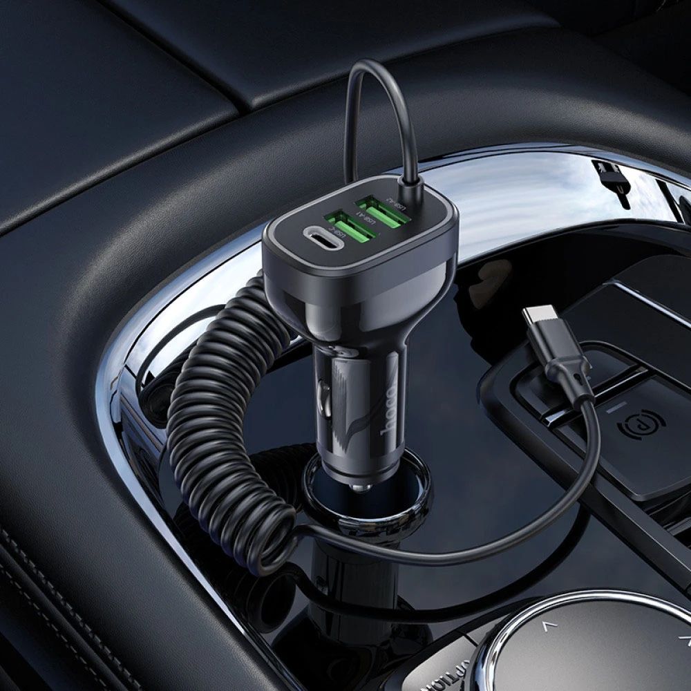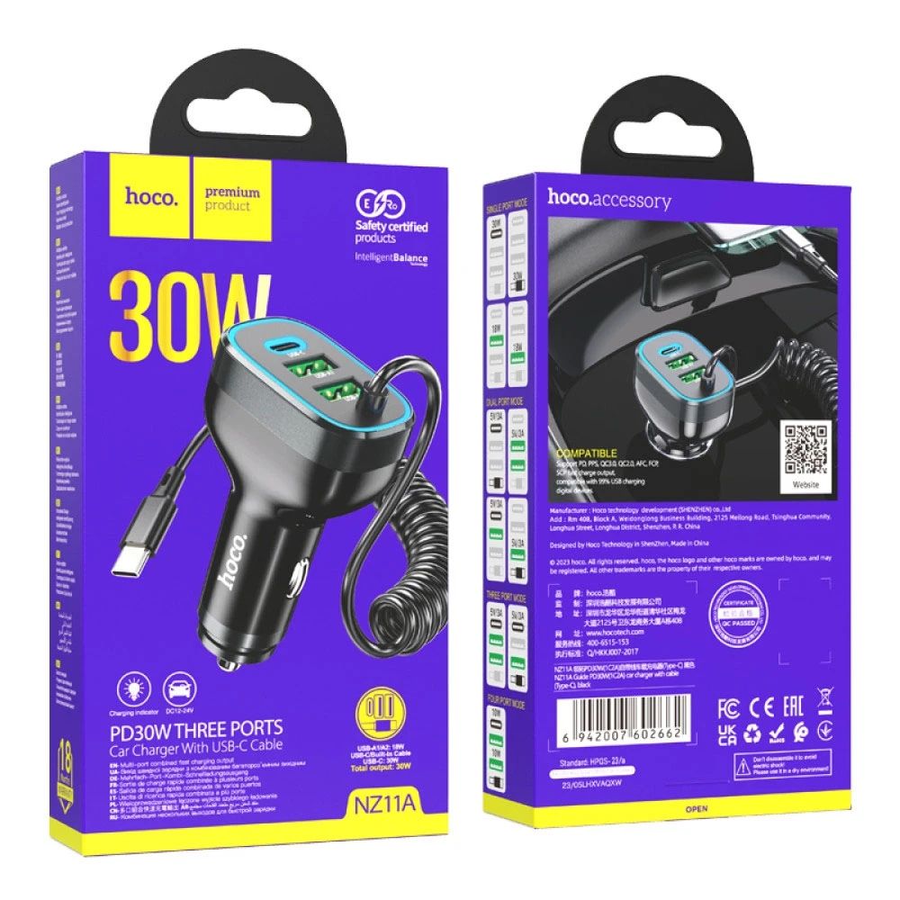 Hoco NZ11A — это универсальное автомобильное зарядное устройство, оснащенное двумя USB-портами, одним портом Type-C с поддержкой протоколов быстрой зарядки PD 30W и встроенным кабелем с разъемом Type-C. Оно обеспечивает эффективную зарядку смартфонов, планшетов, аксессуаров и других мобильных устройств прямо во время поездки. Встроенный кабель с разъемом Type-C и длиной 1.5 м делает устройство полностью готовым к использованию.