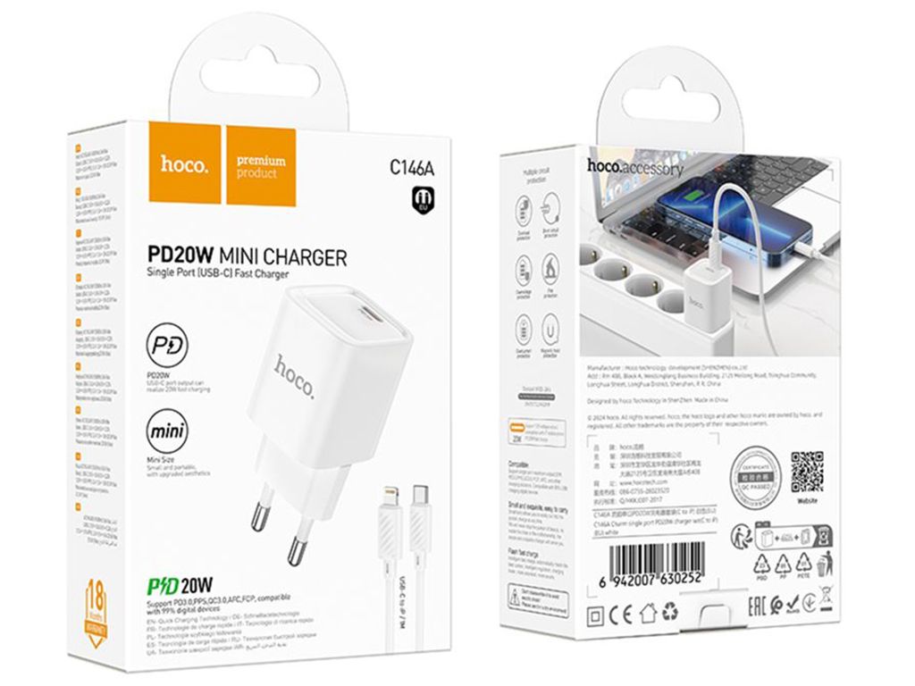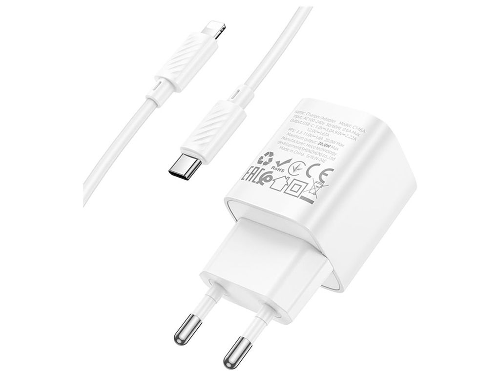 Hoco Сетевое Зарядное Устройство C146A 1USB-C PD/QC 20W+Lightning to Type-C Белый