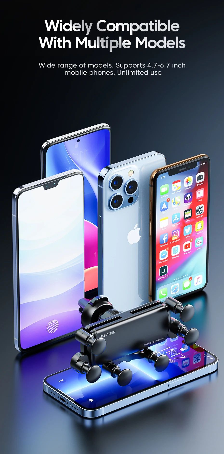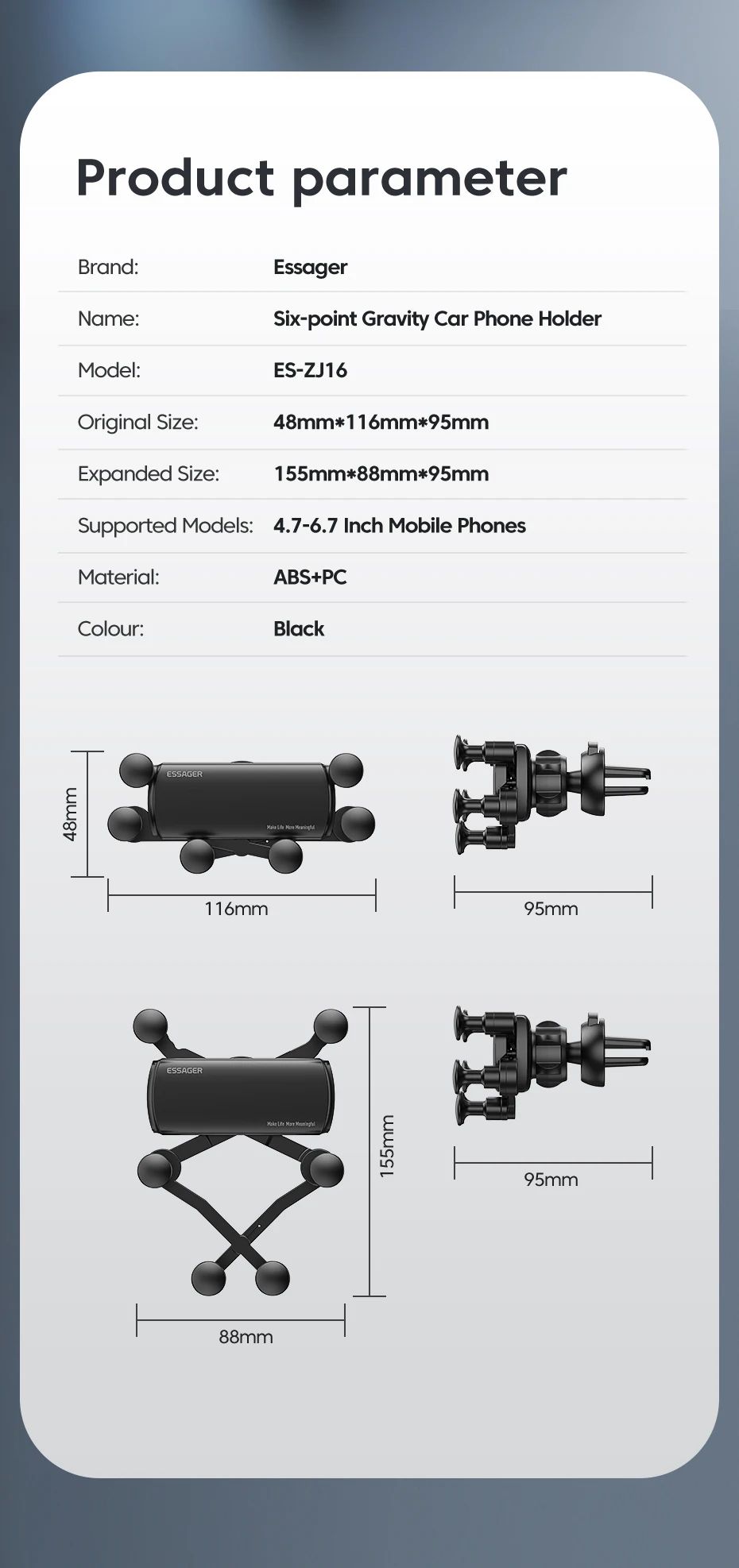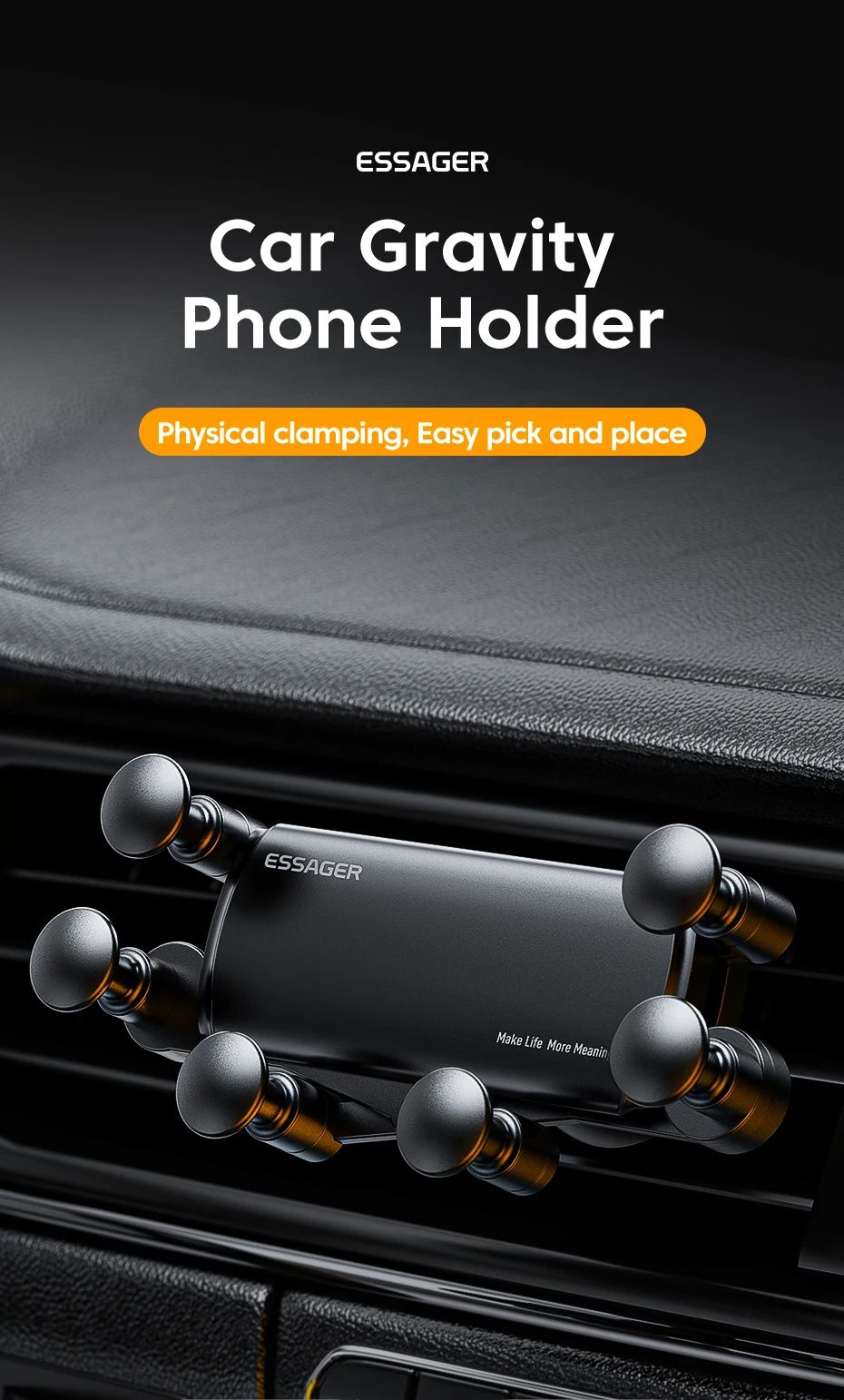 АвтомобильныйдержательEssager Universal 6-points Gravity Car Holder — этонадежное и компактноерешениедлябезопасной и удобнойфиксациисмартфона в автомобиле. Уникальнаяконструкция с шеститочечнымзахватомгарантируетустойчивостьдаженанеровныхдорогах, а системагравитационногозажимапозволяетустанавливатьтелефоноднойрукойзасчитанныесекунды.