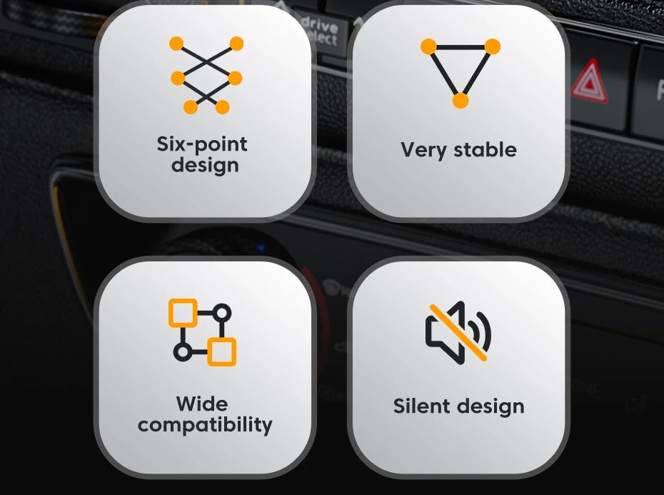 - Держатель сохраняет стабильность при резком торможении, проезде по «лежачимполицейским» или неровным трассам.