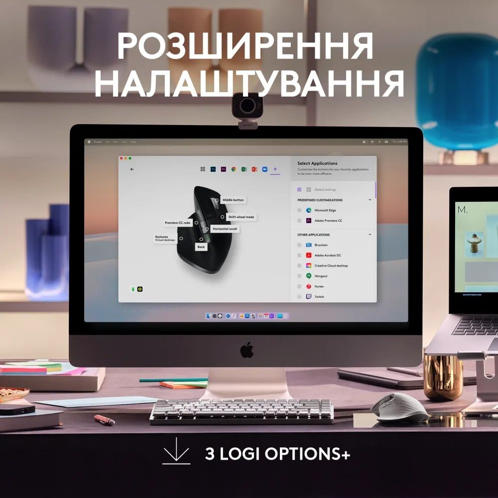 - С помощью Logi Options + можно настраивать кнопки и оптимизировать рабочий процесс для Adobe Photoshop, Final Cut Pro, Google Chrome и других программ.