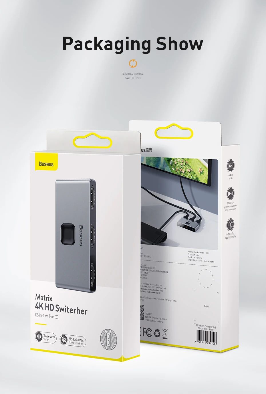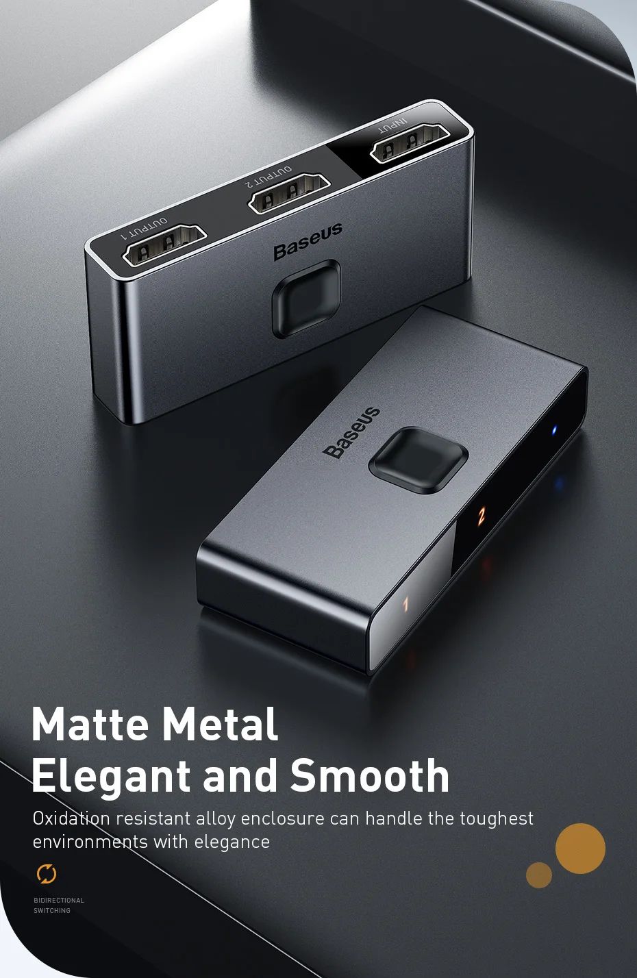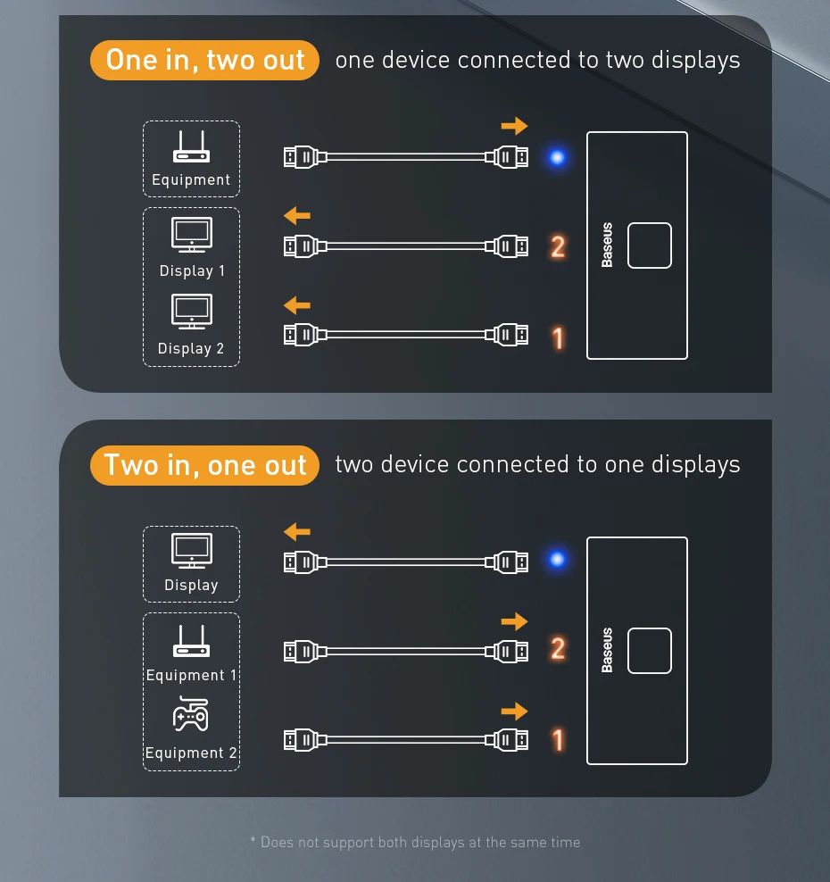 Baseus CAHUB-BC0G HDMI 2.1 Свитч/Переключатель Двунаправленный 4K 144Hz HDR 1to2/2to1 для PS5/4/3/TV Box/Xbox/PC Grey-Black