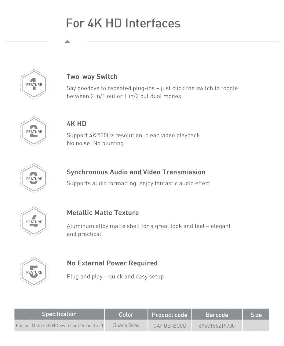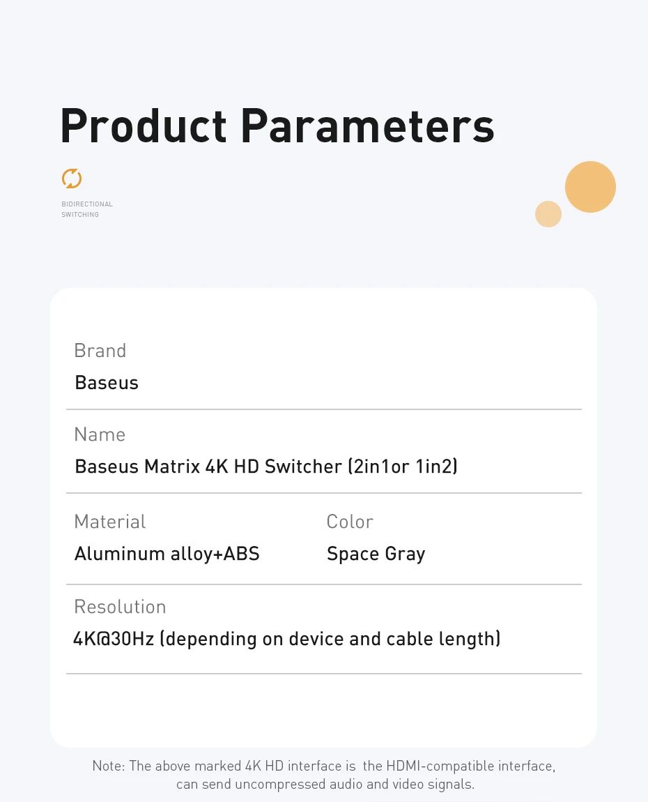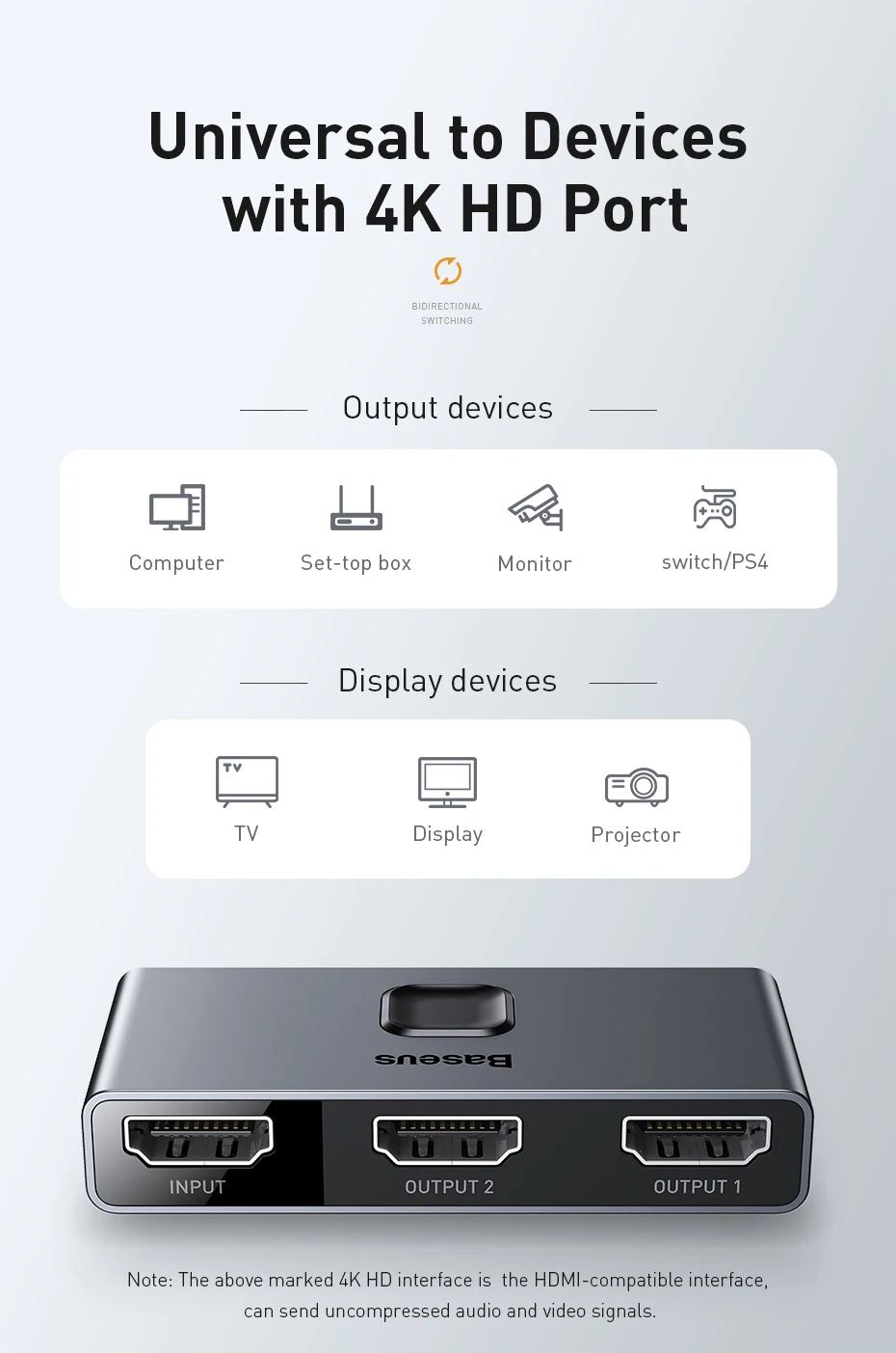 Baseus CAHUB-BC0G HDMI 2.1 Свитч/Переключатель Двунаправленный 4K 144Hz HDR 1to2/2to1 для PS5/4/3/TV Box/Xbox/PC Grey-Black