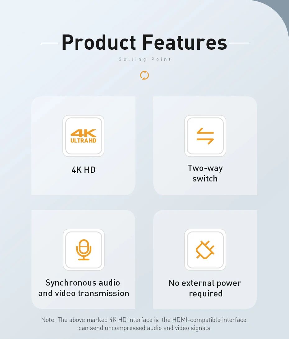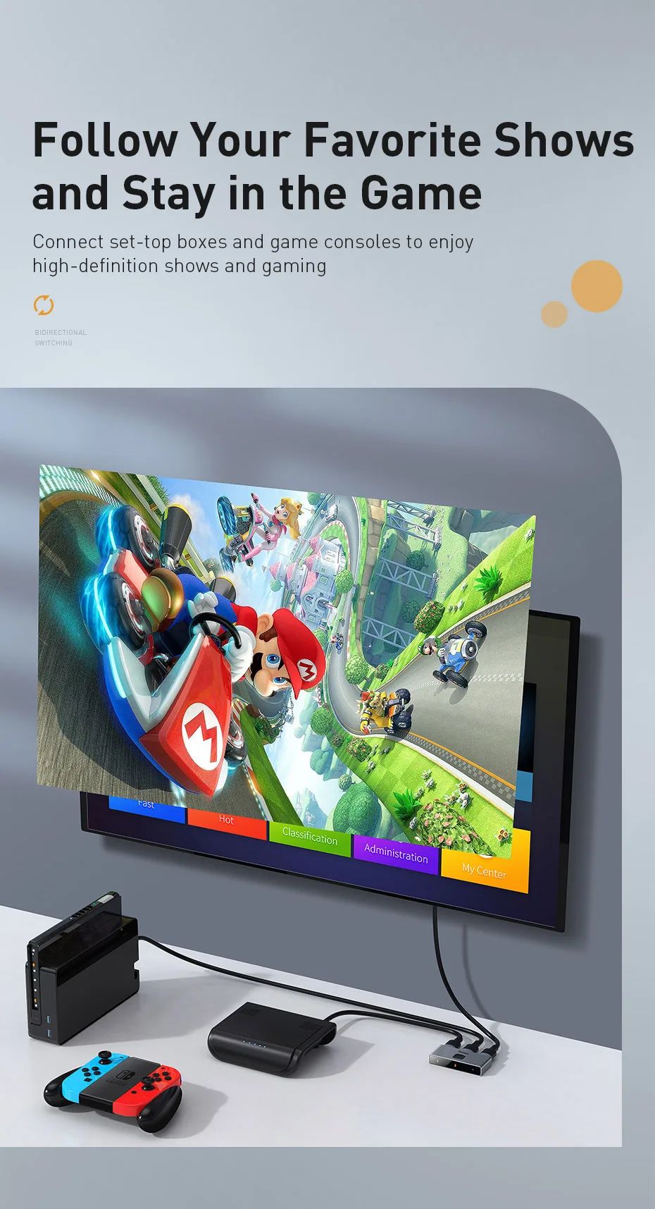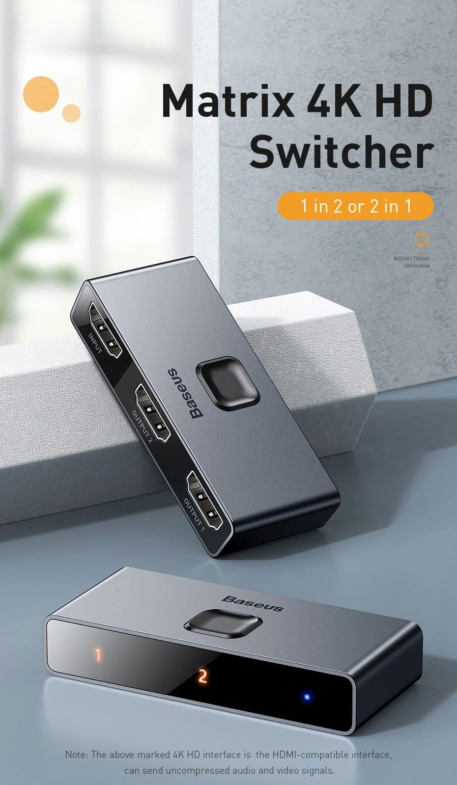 Этокомпактныйдвунаправленный HDMI-переключатель, которыйпозволяетподключатьнесколькоустройств к одномудисплеюилиодинисточниксигнала к двумэкранам. Онподдерживаетсовременныестандартыпередачивидео и аудио, обеспечиваякачественноеизображение в формате 4K и насыщенныйзвукбезпотерь.