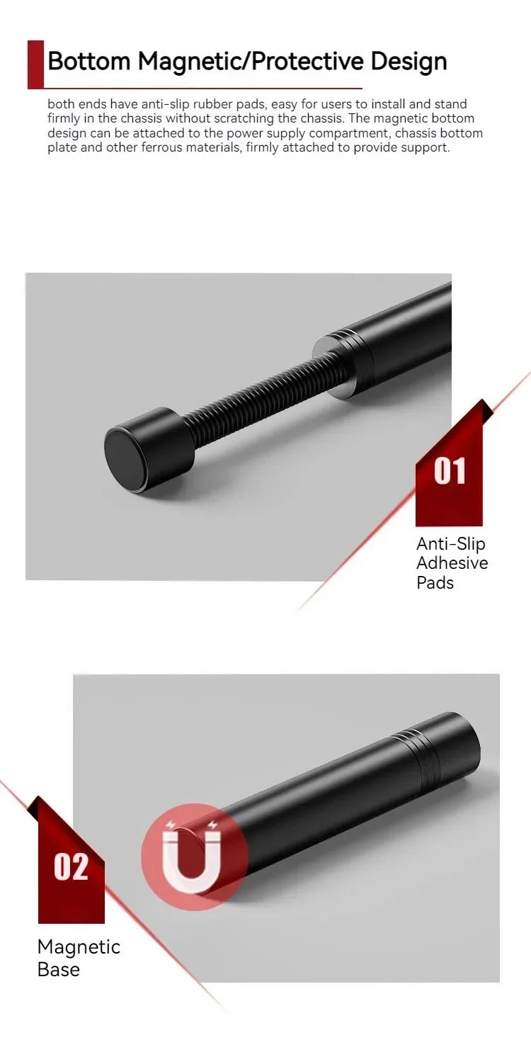 - Высота подпорки легко настраивается в диапазоне 74–120 мм, что позволяет адаптировать держатель под разные корпуса и видеокарты.