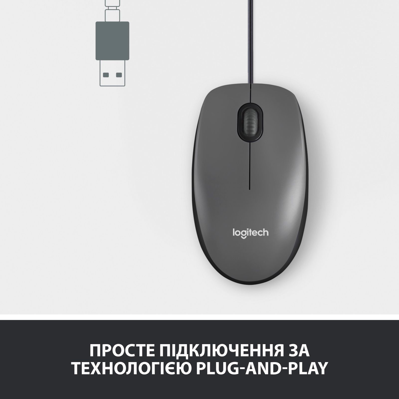 - Logitech M100 не требует установки драйверов или дополнительного ПО. Просто подключите мышь к USB-порту — и она готова к работе.