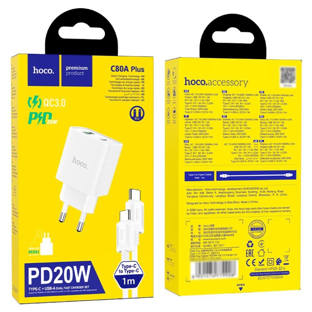Быстрое сетевое зарядное устройство Hoco C80A Plus USB/ Type-C QC PD белое + кабель Type-C to Type-C