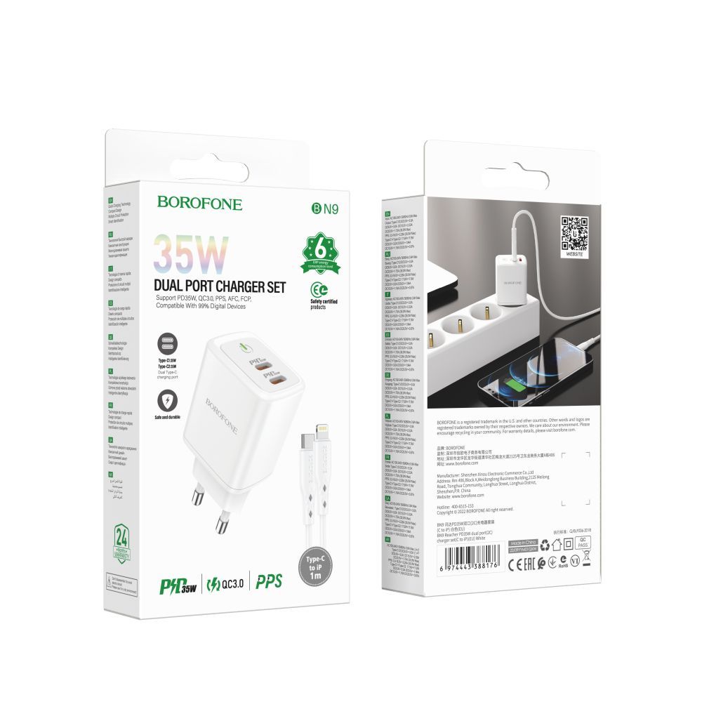 Сетевой адаптер Borofone BN9 Reacher PD/QC (2 USB-C) 35W Type-C to Lightning в белом цвете