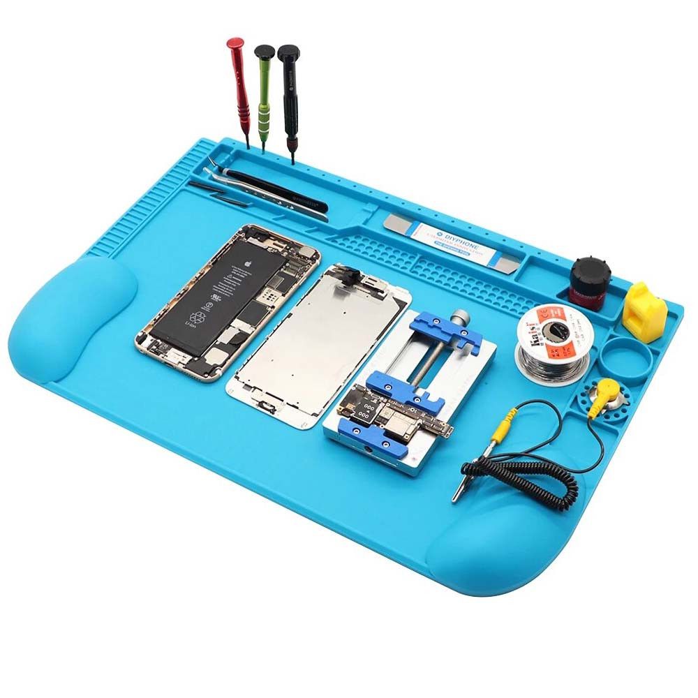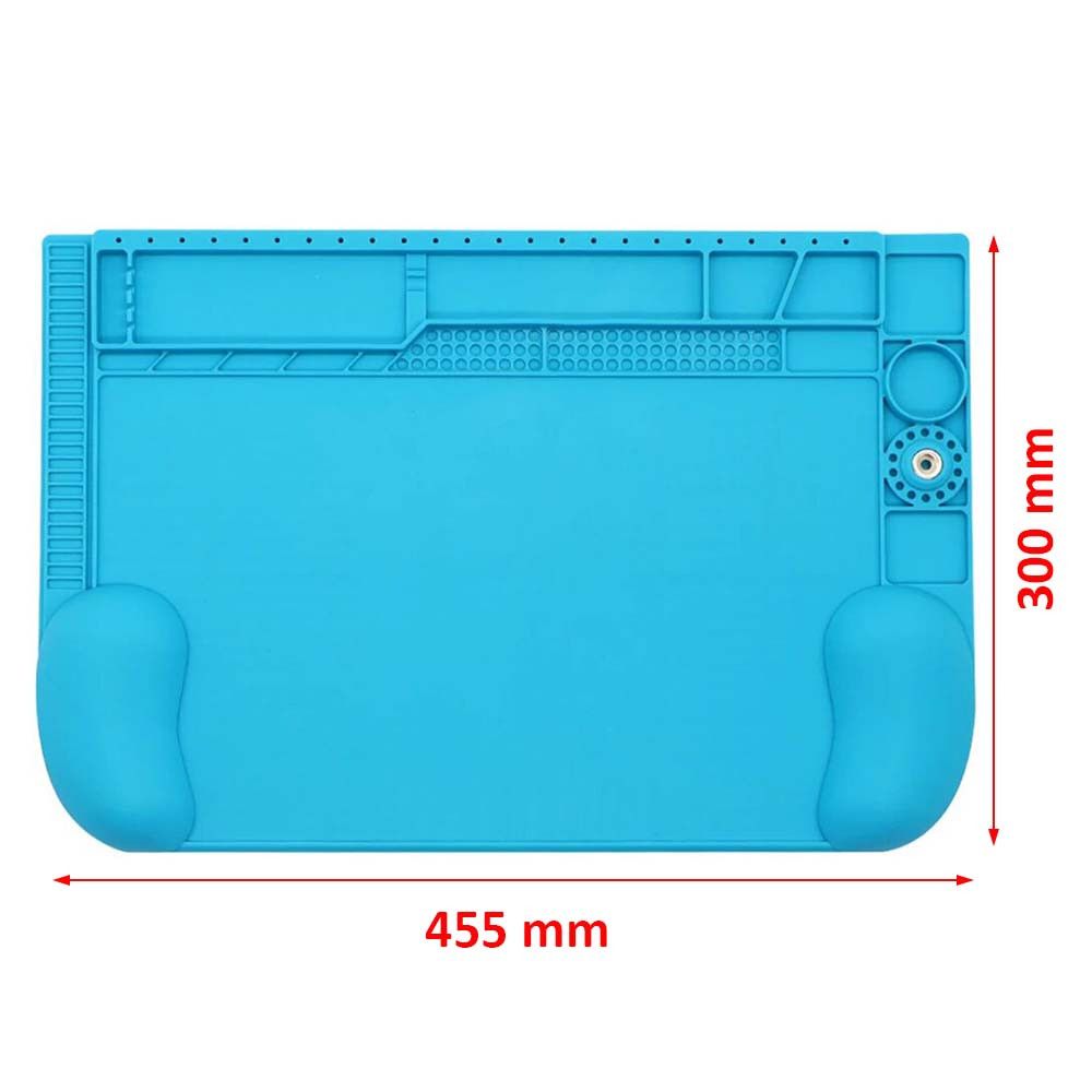 - Этот коврик надёжно защищает стол или верстак от механических повреждений, царапин, а также термического воздействия горячих паяльников и компонентов. Силикон не деформируется даже при длительном нагреве.