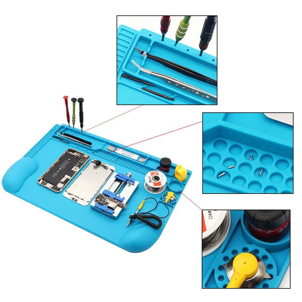 - Поверхность коврика оснащена встроенными отсеками, ячейками и углублениями для хранения инструментов, винтов, микросхем и других мелких компонентов. Это позволяет поддерживать порядок и экономить время при ремонте.