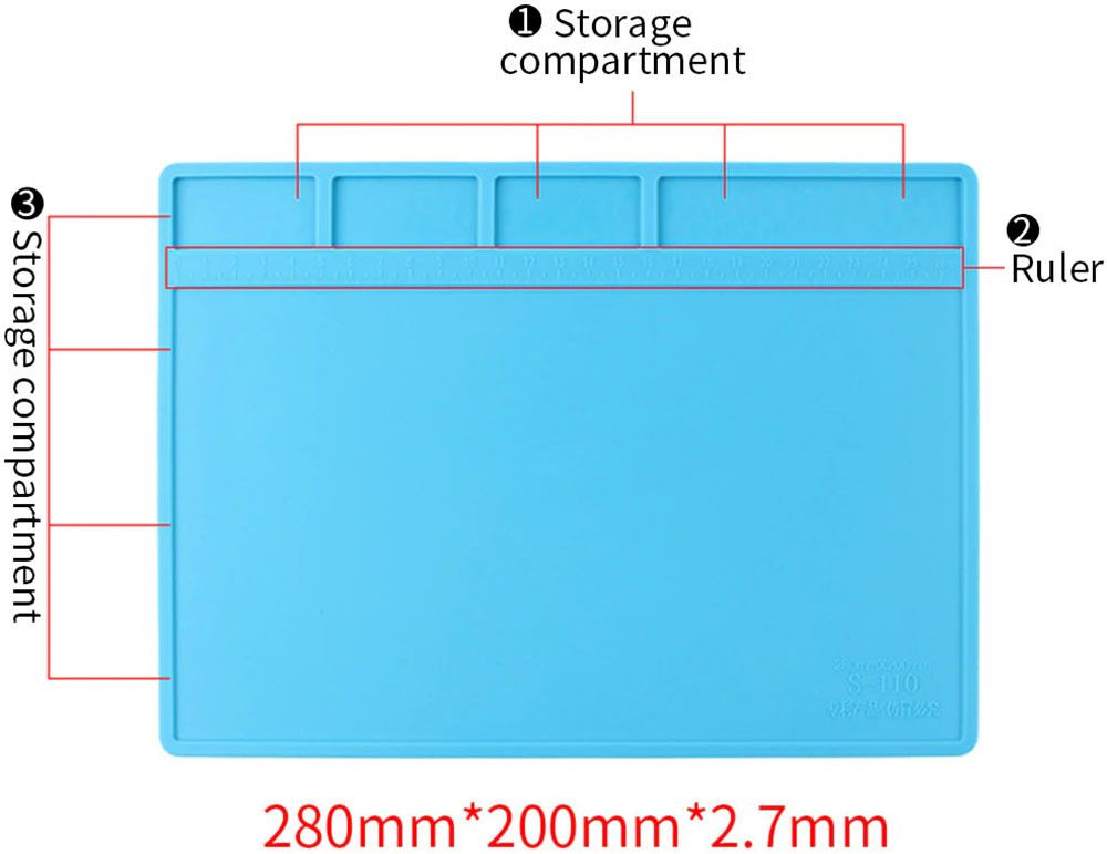- Коврик из силикона предотвращает появление царапин, ожогов и других повреждений от горячих инструментов, паяльников и припоя.