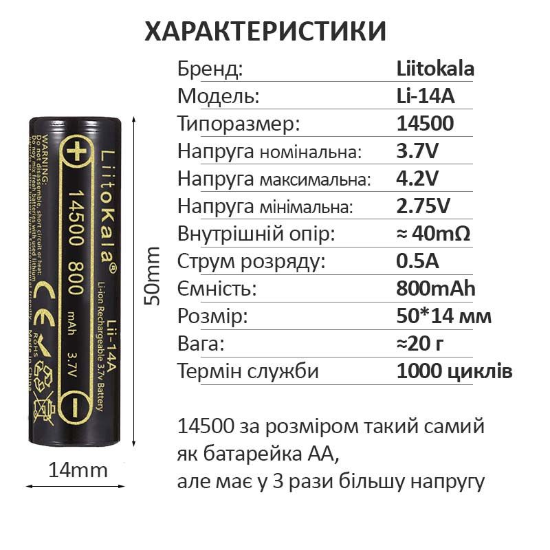 Аккумулятор LiitoKala Lii-14A 14500 / 3.7V / 0.5A / 800 mAh Original