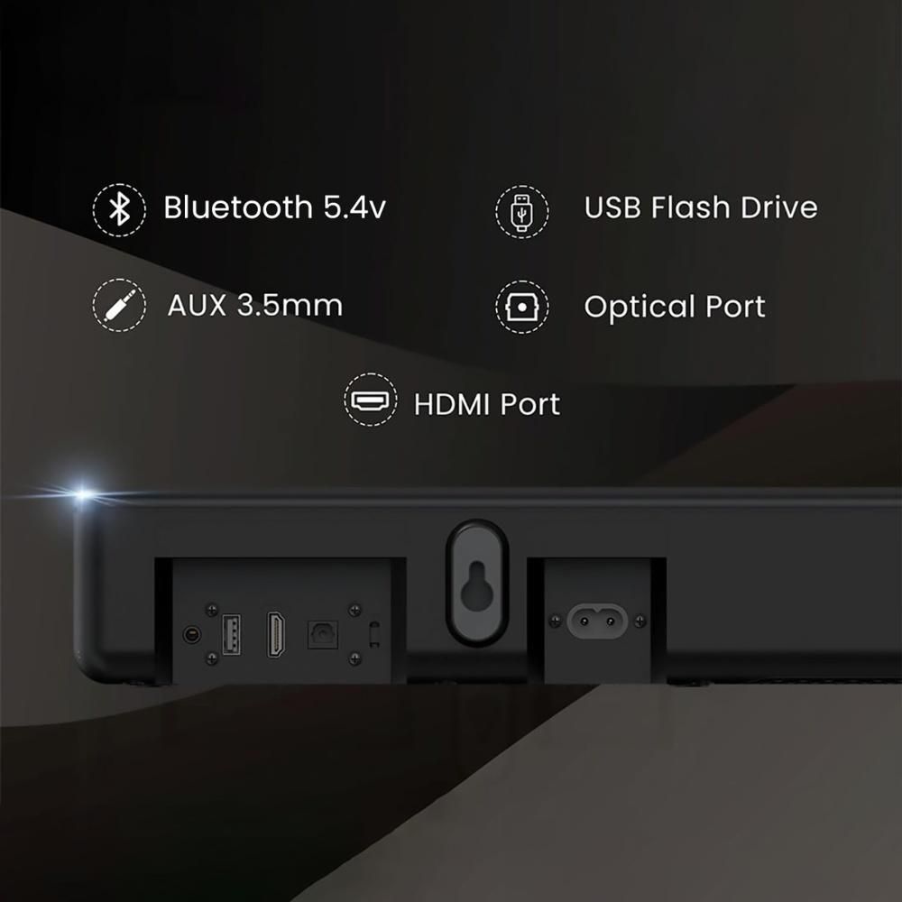 - Саундбар оснащён всеми необходимыми портами для подключения — HDMI, оптический вход, AUX и USB. Беспроводная технология Bluetooth 5.4 обеспечивает быстрое и стабильное соединение со смартфонами, ноутбуками и телевизорами.
