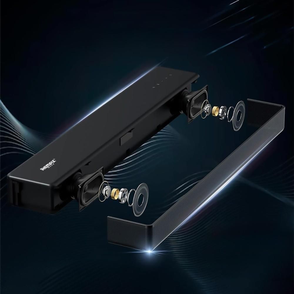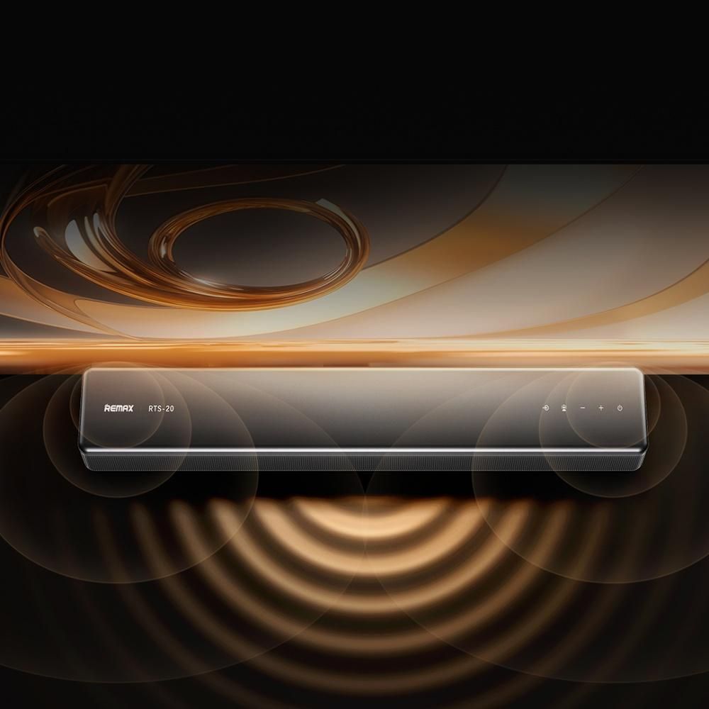 - Remax RTS-20 выполнен в классическом стиле с гладким корпусом и металлической решёткой. Тонкий форм-фактор (всего 6 см в высоту) позволяет установить саундбар под телевизор или разместить на столе, не занимая лишнего пространства.
