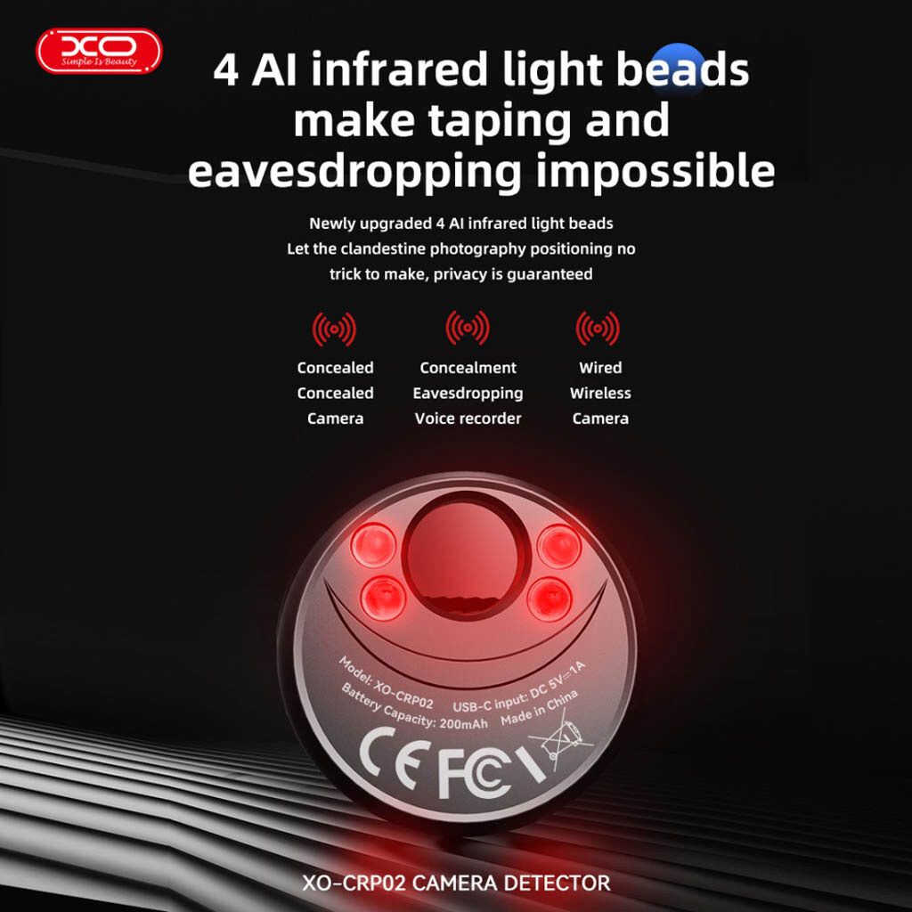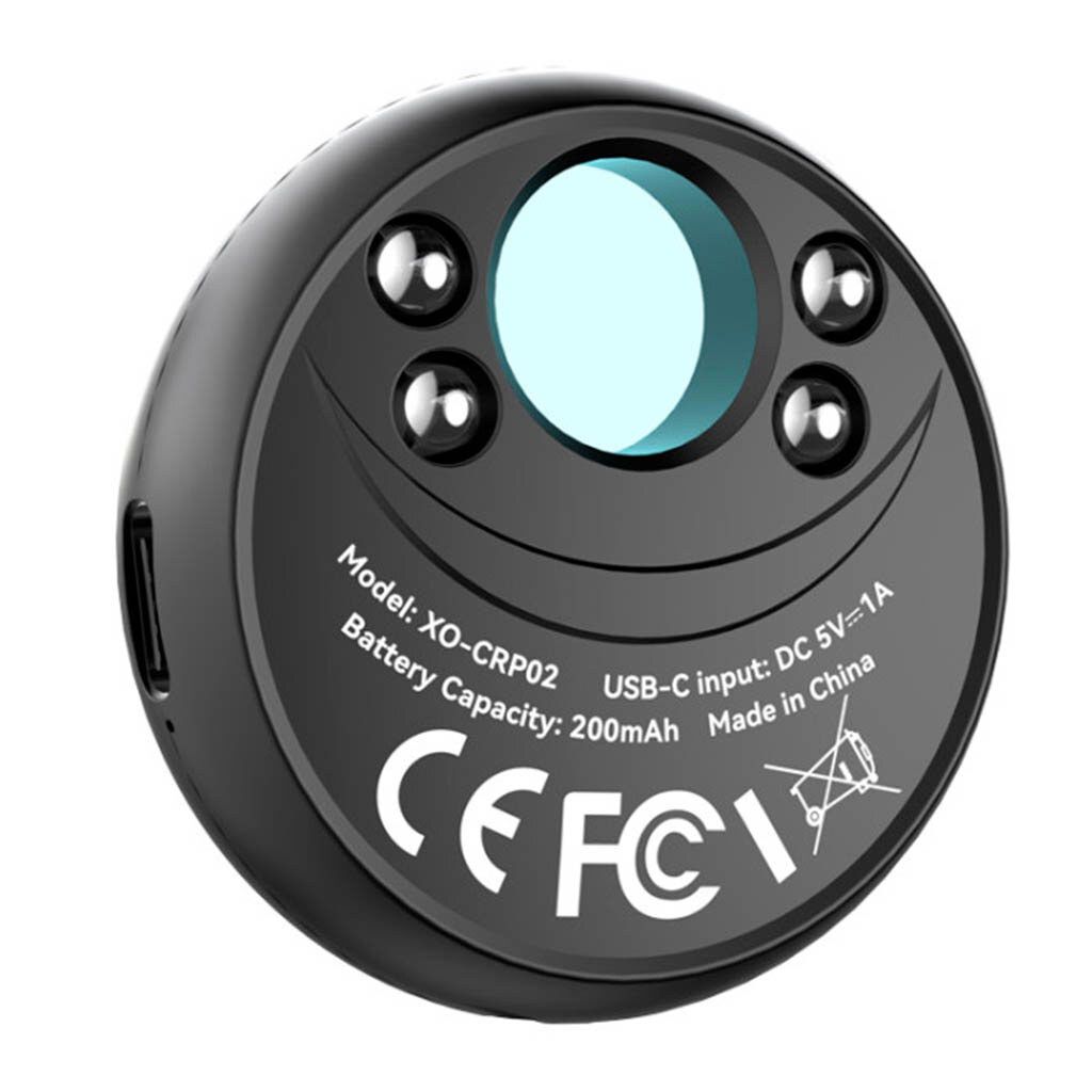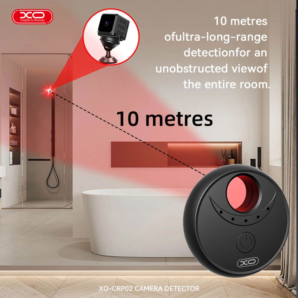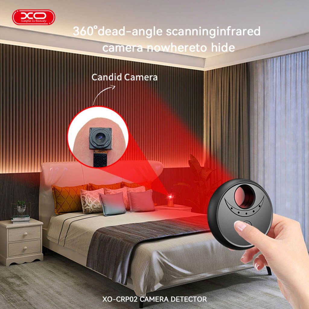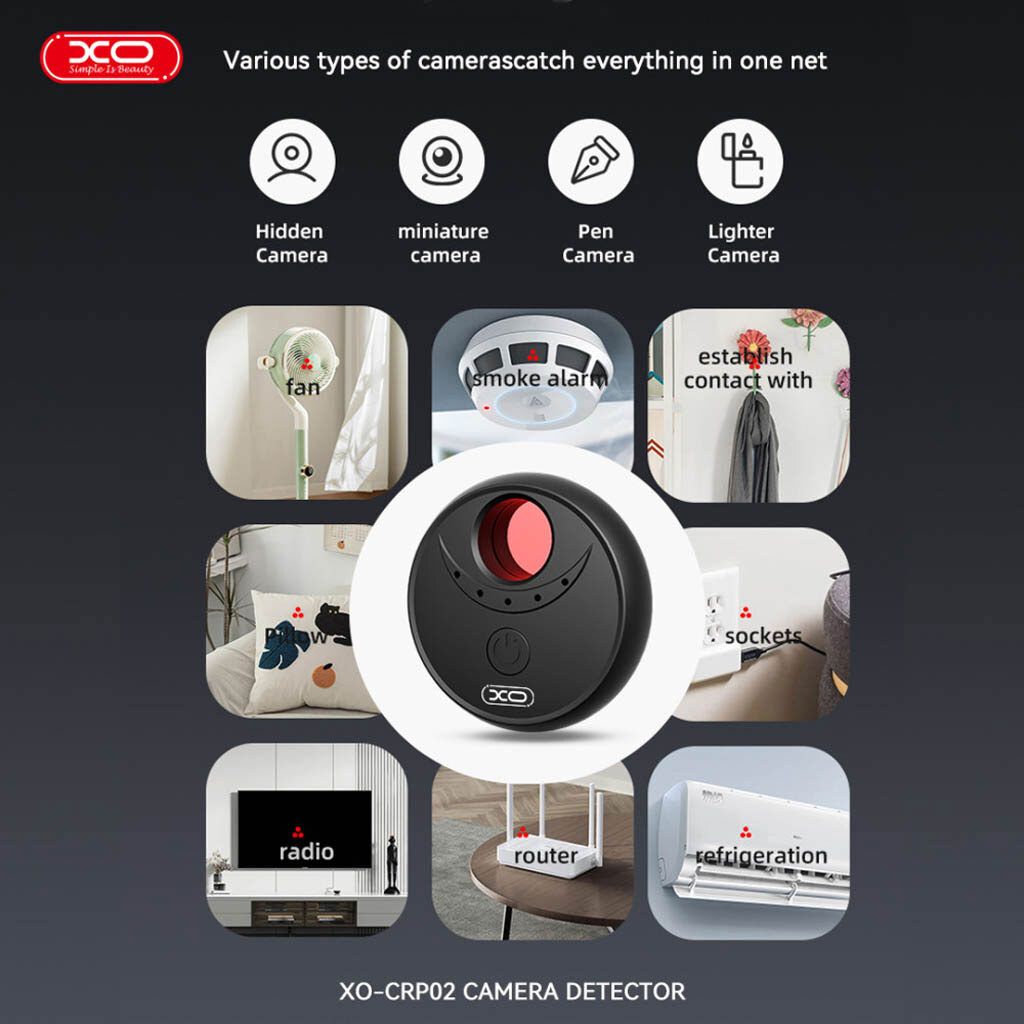 - XO CRP02 использует инфракрасную технологию обнаружения, позволяющую визуально фиксировать отражение света от линз скрытых камер. Это делает устройство эффективным инструментом для поиска миниатюрных камер, спрятанных в розетках, лампах, телевизорах, часах и других предметах.